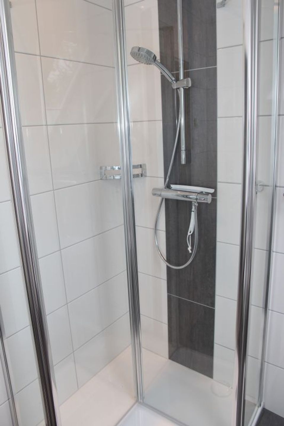 Das moderne Badezimmer verfügt über eine Eckdusche, einen Fön und ausreichend Abstellmöglichkeiten.