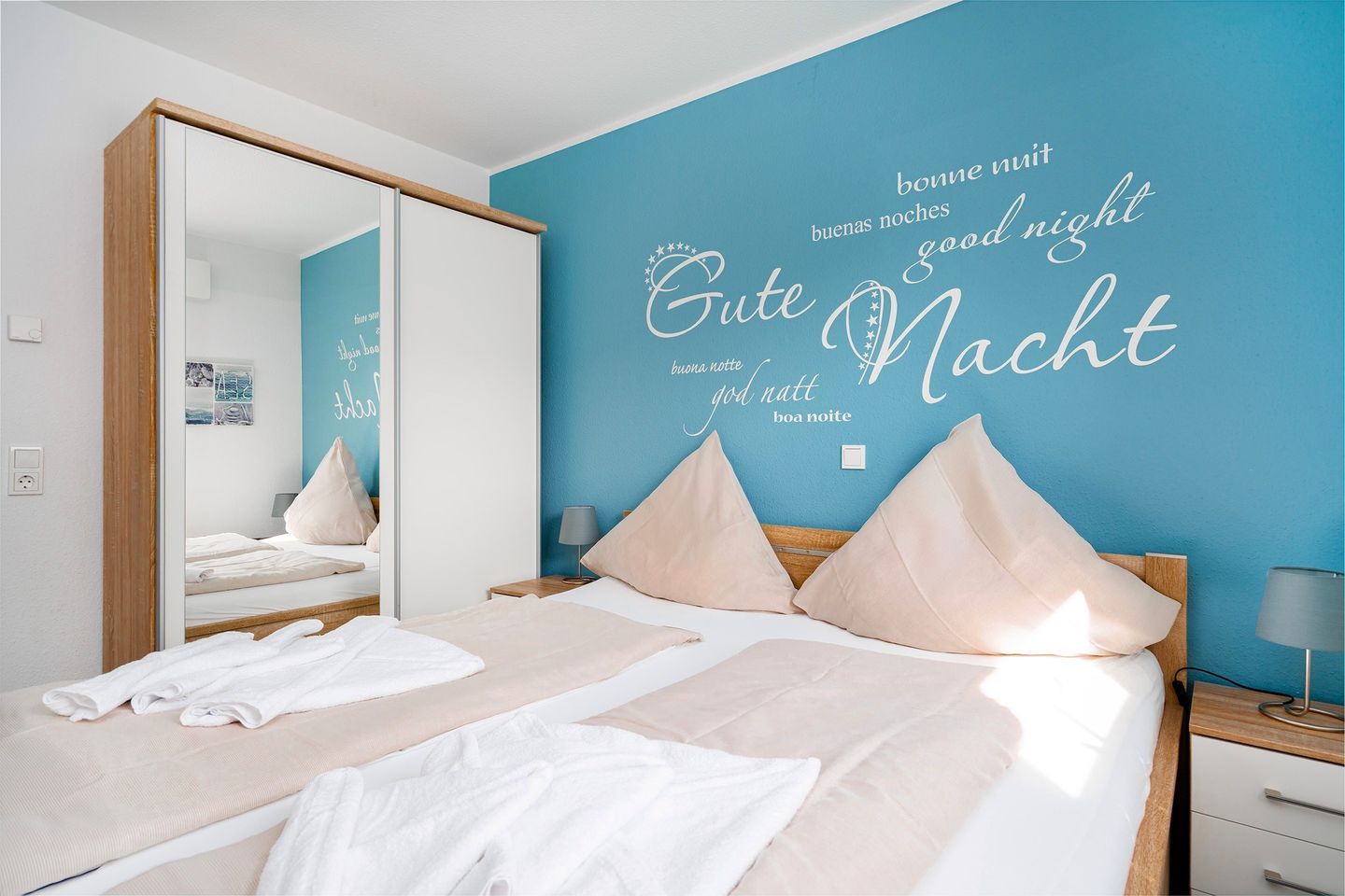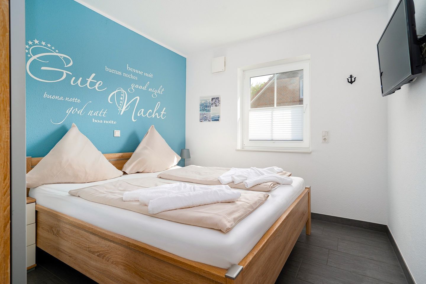 Es gibt zwei gemütliche Schlafräume mit einem Doppelbett bzw. zwei Einzelbetten und TV, der als Smart-TV nutzbar ist. Die Schlafzimmer verfügen beide über elektrische Außenjalousien.
