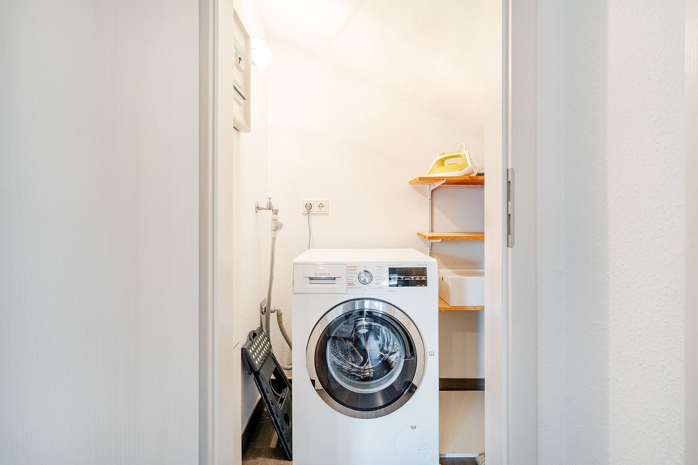 Die Wohnung verfügt auch über ein Gäste-WC. Des Weiteren sind ein Bügelbrett, ein Bügeleisen und ein Wäscheständer vorhanden.