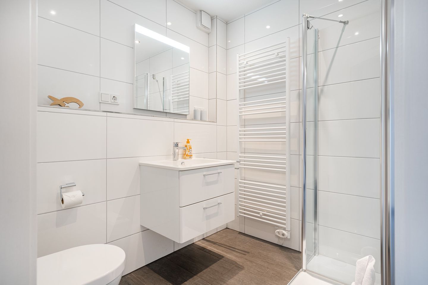 Das moderne Bad ist mit einer Dusche mit minimalem Einstieg und einem Handtuchwärmer ausgestattet, ein Fön ist auch vorhanden. Ein Waschtrockner steht Ihnen kostenlos zur Verfügung.