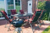 Sie finden 4 Hochlehner, 2 Hochlehner mit Liegefunktion sowie zwei Sonnenliegen. Neben einem Sonnenschirm mit fahrbarem Ständer finden sie auch einen großen Ampelschirm. Die Terrasse ist zur Sonnenseite ausgerichtet und bietet einen wunderschönen Blick auf das Siel. Für Schatten sorgt nachmittags ein Zierkischenbaum.