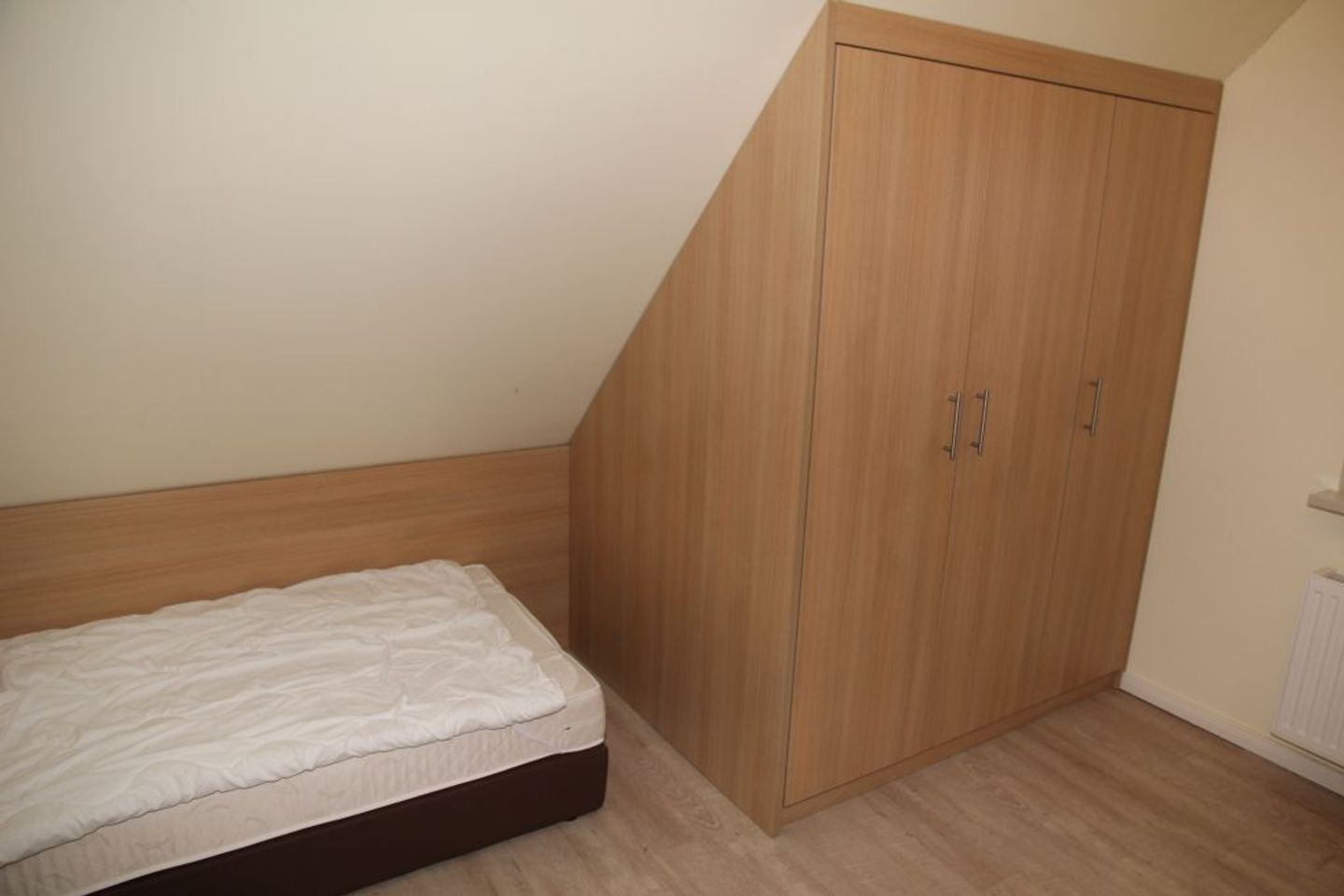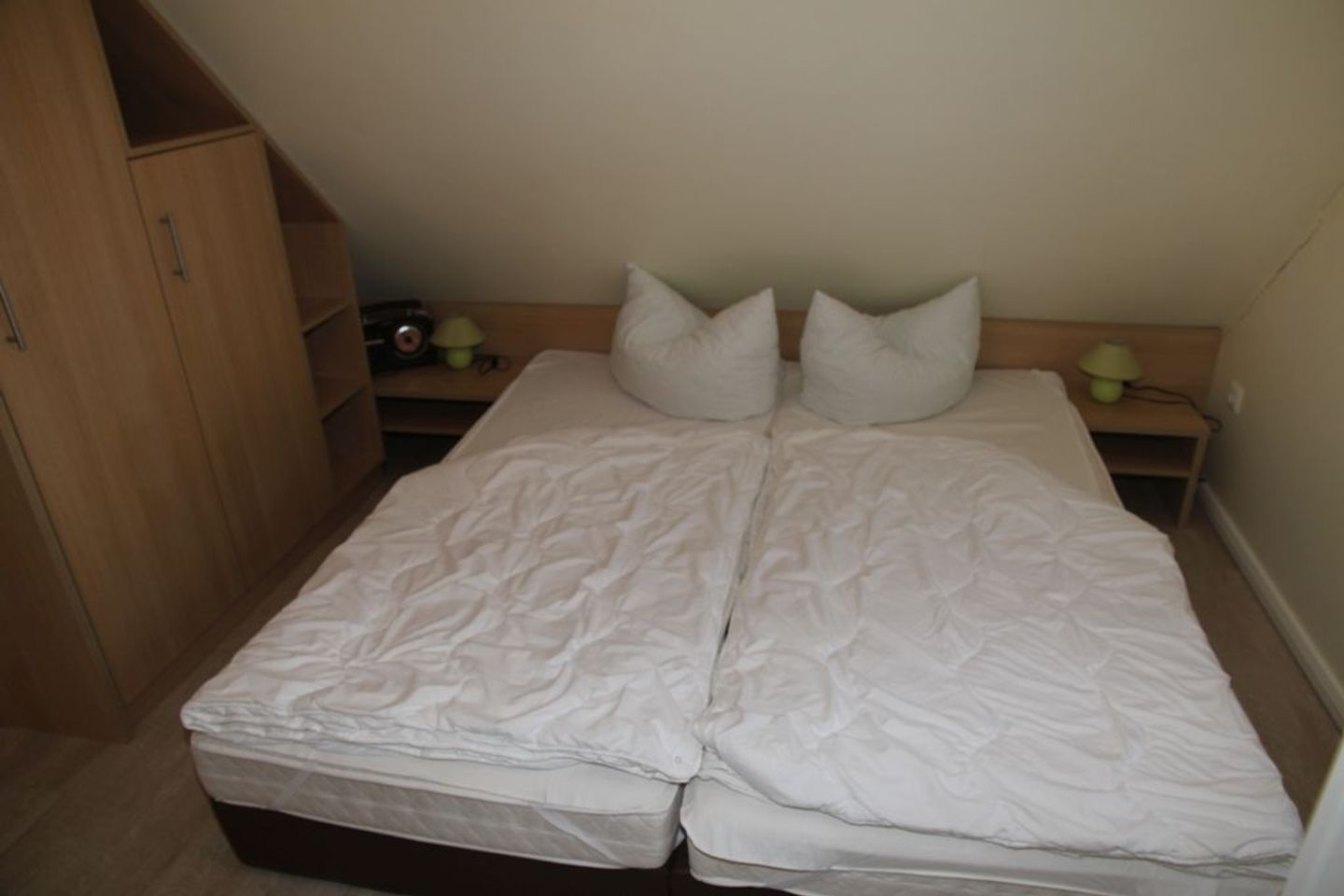 Das zweite Schlafzimmer im Obergeschoss ist mit einem Doppelbett und einem Einzelbett ausgestattet, im Wandschrank befindet sich ein Regal-Safe und neben dem Einzelbett steht ein kleiner Fernseher mit DVD-Spieler.