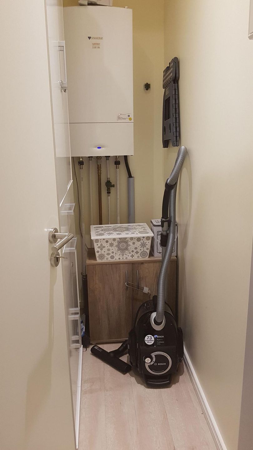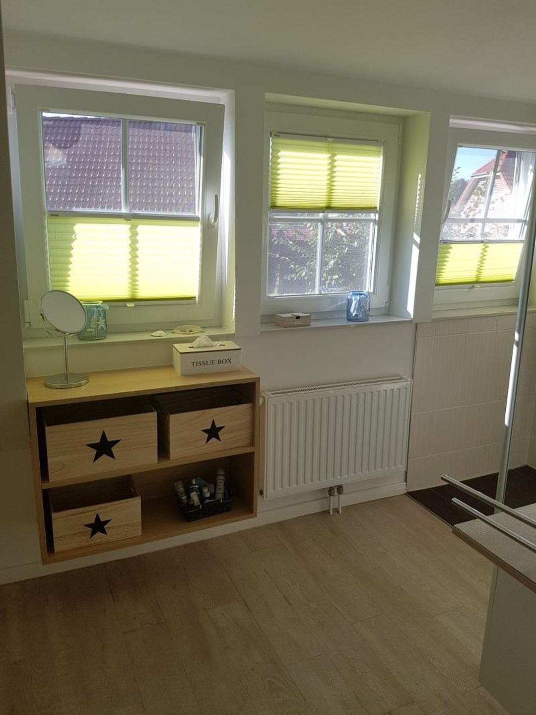 Im Erdgeschoss finden Sie ein großzügiges Bad mit bodentiefer Dusche, Waschbecken mit großem Spiegel und WC, sowie die Sauna für 2 bis 5 Personen. Der Waschtrockner bietet einen Stauraum von 5kg, für kleine Missgeschicke ist ein Erste-Hilfe-Schrank angebracht. Im kleinen Hauswirtschaftsraum finden Sie auch ein Bügelbrett mit Bügeleisen und Wäschespinne.
