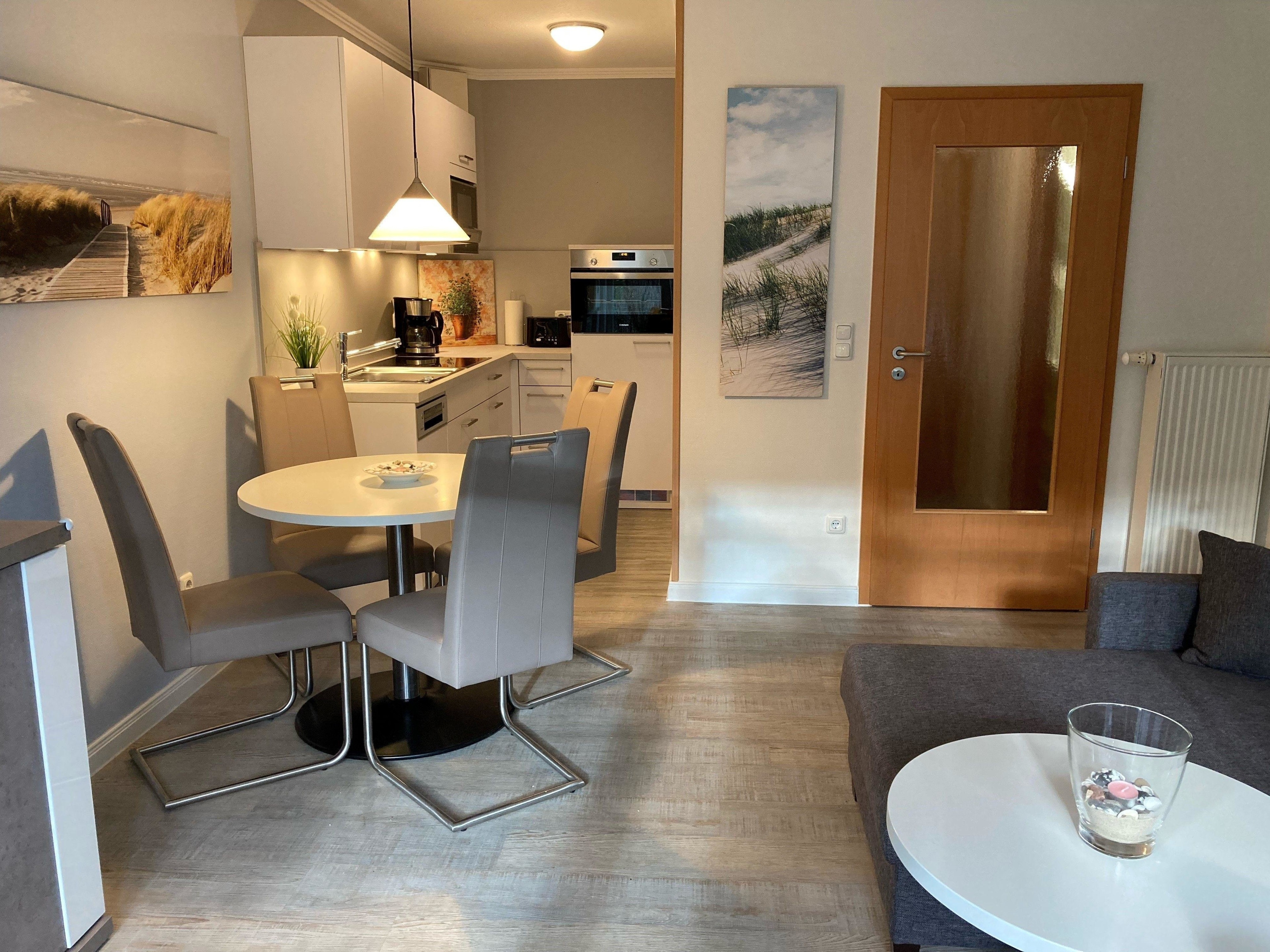 Der Esstisch mit 4 Stühlen sorgt für den charmanten Übergang zum Wohnzimmer. Hier werden die gemeinsamen Mahlzeiten angerichtet oder auch fröhliche Spielabende veranstaltet.