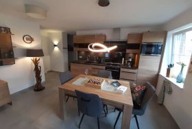 Die moderne Küche ist komplett und hochwertig ausgestattet (Backofen, Cerankochfeld, extragroßer Kühlschrank mit Gefrierfach, Geschirrspülmaschine, Mikrowelle, Philips-Senseo-Padmaschine, Filterkaffeemaschine, Wasserkocher, Toaster, Eierkocher, Teeservice u.v.m.).