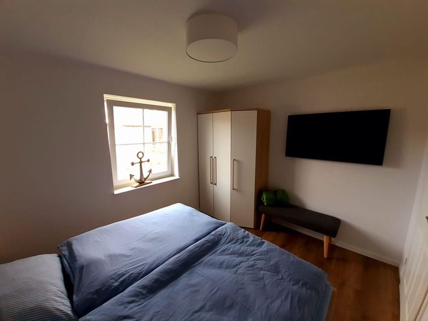 Das Wohnzimmer bietet eine gemütliche und bequeme Eckcouch und einen großen Fernseher (Smart-TV). Das vorhandene Radio ist mit DAB +, einer Bluetooth-Schnittstelle zur Nutzung von Streaming-Diensten über das eigene Smartphone sowie einer WLAN-Schnittstelle zum Empfang von Internet-Radio ausgestattet. Eine umfassende Spiele- und Büchersammlung (u. a. Ostfriesenkrimis) verspricht entspannte Stunden in der Wohnung.