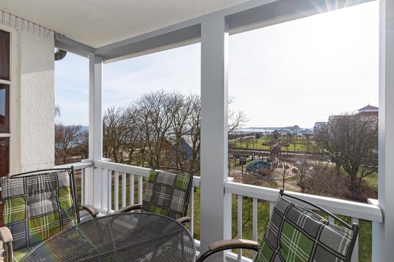 Vom modern eingerichteten Balkon aus genießen Sie einen seitlichen Blick auf das Meer in Richtung Osten. Eine kleine Wohlfühloase erwartet Sie hier, auf der Sie den Sonnenaufgang genießen und in Ruhe mit Blick auf den Hafen frühstücken können. In geselliger Runde am Abend einen ereignisreichen Tag bei einem leckeren Getränk ausklingen lassen....Urlaubs-Feeling pur!