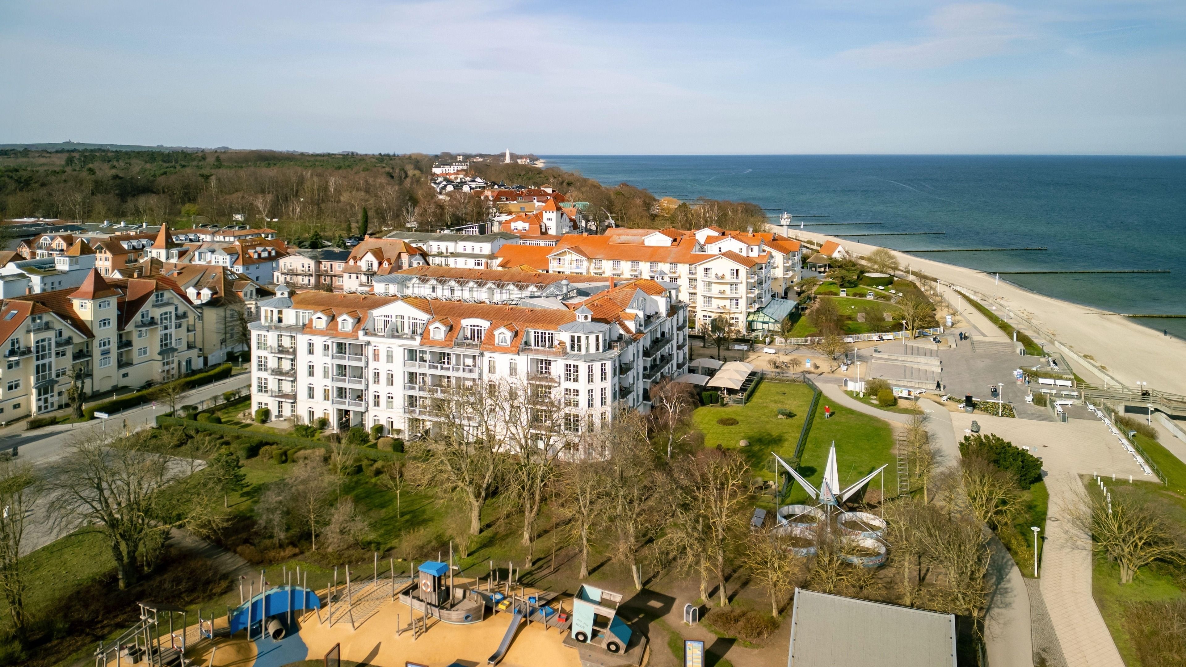 Schon beim Betreten der einladenden Terrasse mit angrenzender Grünfläche kommt Urlaubsstimmung auf! Genießen Sie von hier den eindrucksvollen Blick auf die Promenade, die Seebrücke und das Meer! Moderne Gartenmöbel laden zum Verweilen mit der ganzen Familie ein.