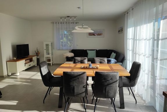 Dieses tolle Haus überzeugt auf 100qm mit vielen Annehmlichkeiten: Durch den Flur kommen Sie direkt in den offenen und hellen Wohnbereich mit Küche. In der Küche finden Sie alle notwendigen Geräte und Ausstattungsmerkmale für Ihren Urlaub: Kühlschrank mit Gefrierfach, Cerankochfeld, Backofen, Kaffeemaschine, Wasserkocher, Spülmaschine etc. Die Küche geht direkt über in den Wohn-/Essbereich mit Stühlen und Esstisch und einem großzügigen L-Sofa. Auch ein großer Flachbildfernseher sowie ein Kaminofen sind hier vorhanden. Von hier aus können Sie auch auf die möblierte Terrasse mit angrenzendem Garten hinaustreten, der auch eingezäunt ist.