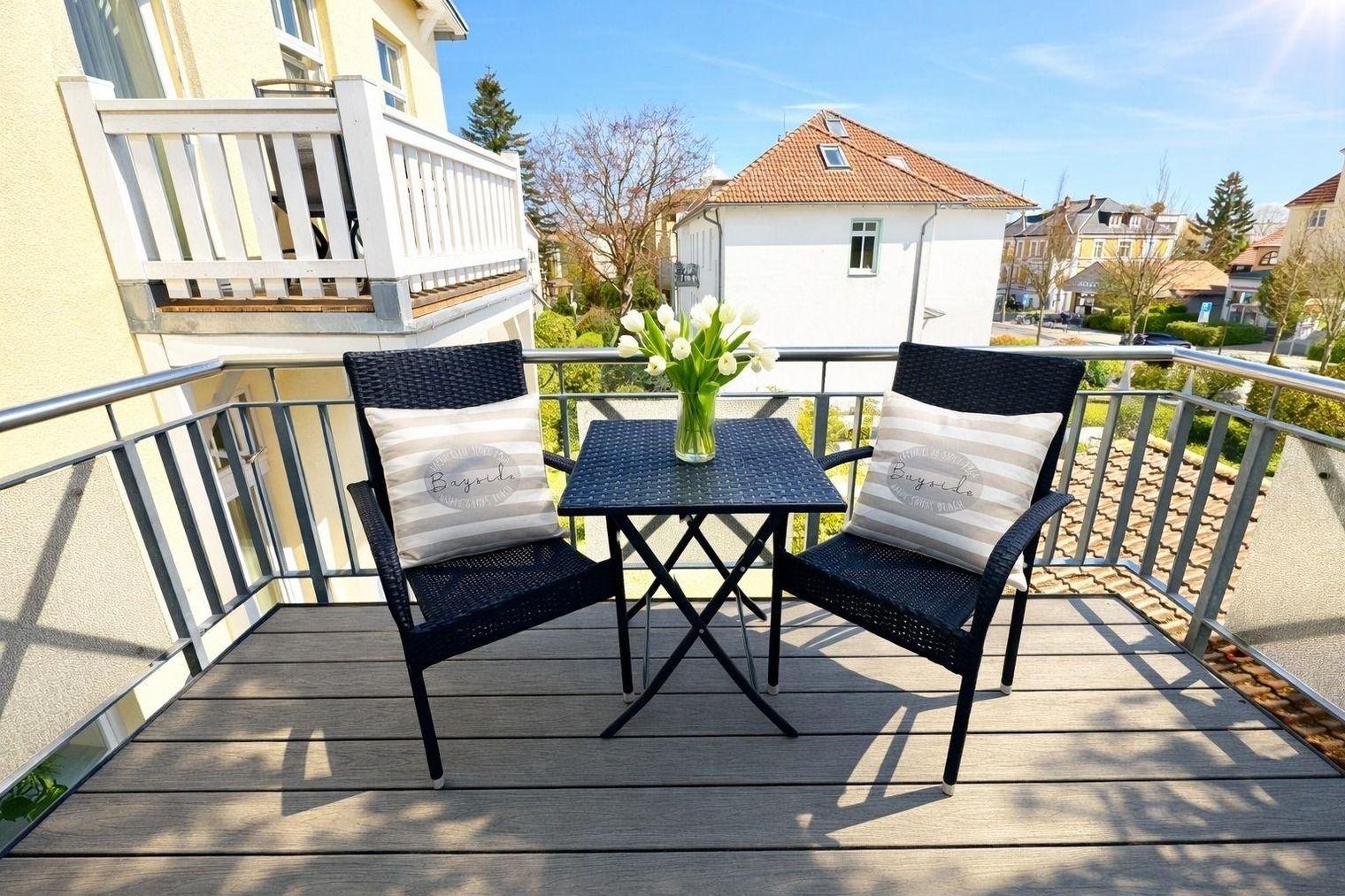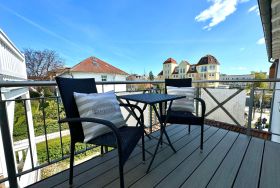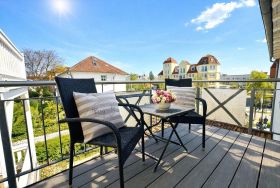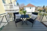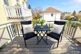 Ein großer Balkon zur Nordseite, der mit Sitzmöbeln und einem Tisch ausgestattet ist, kann über das Wohnzimmer betreten werden.