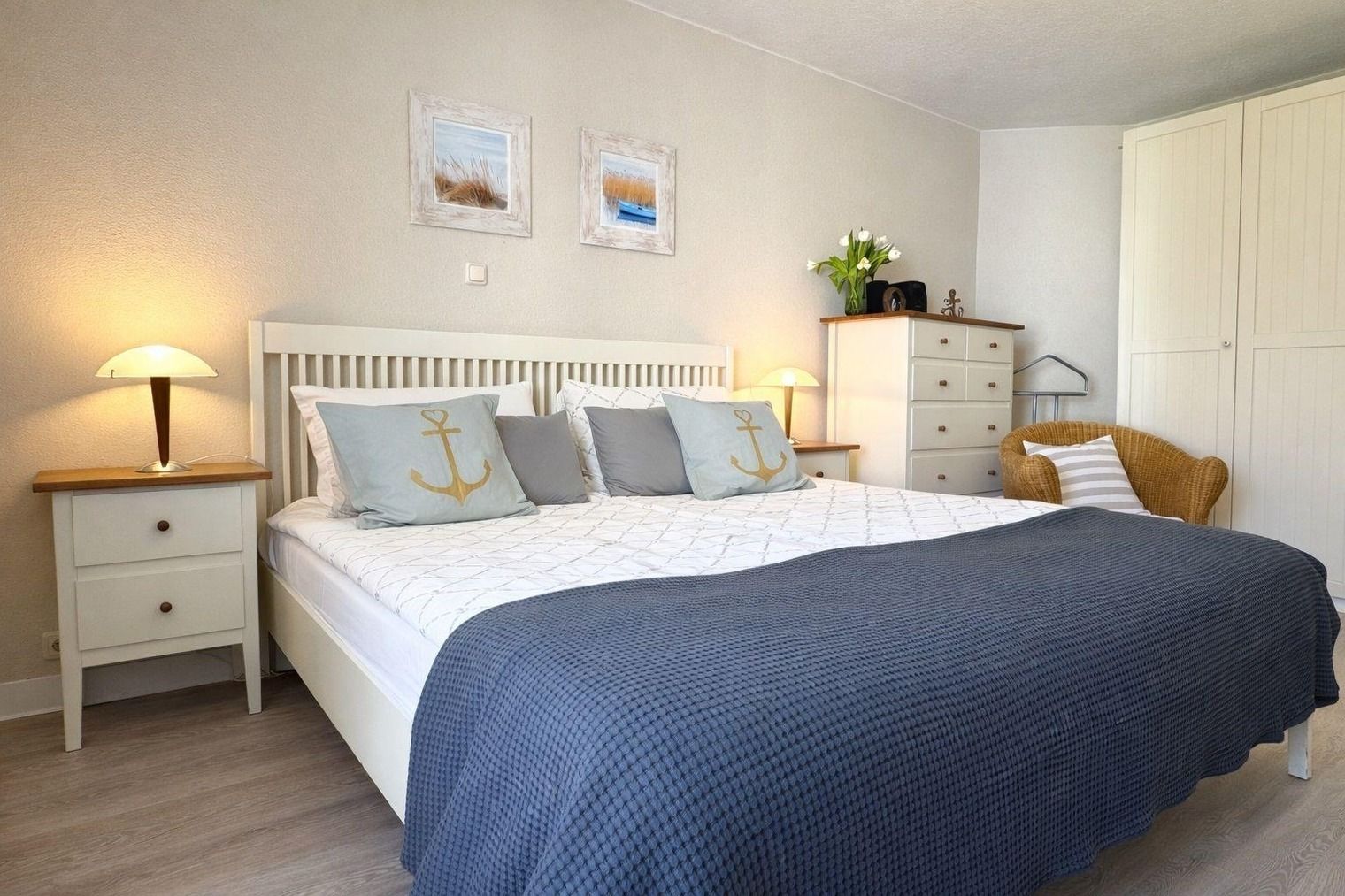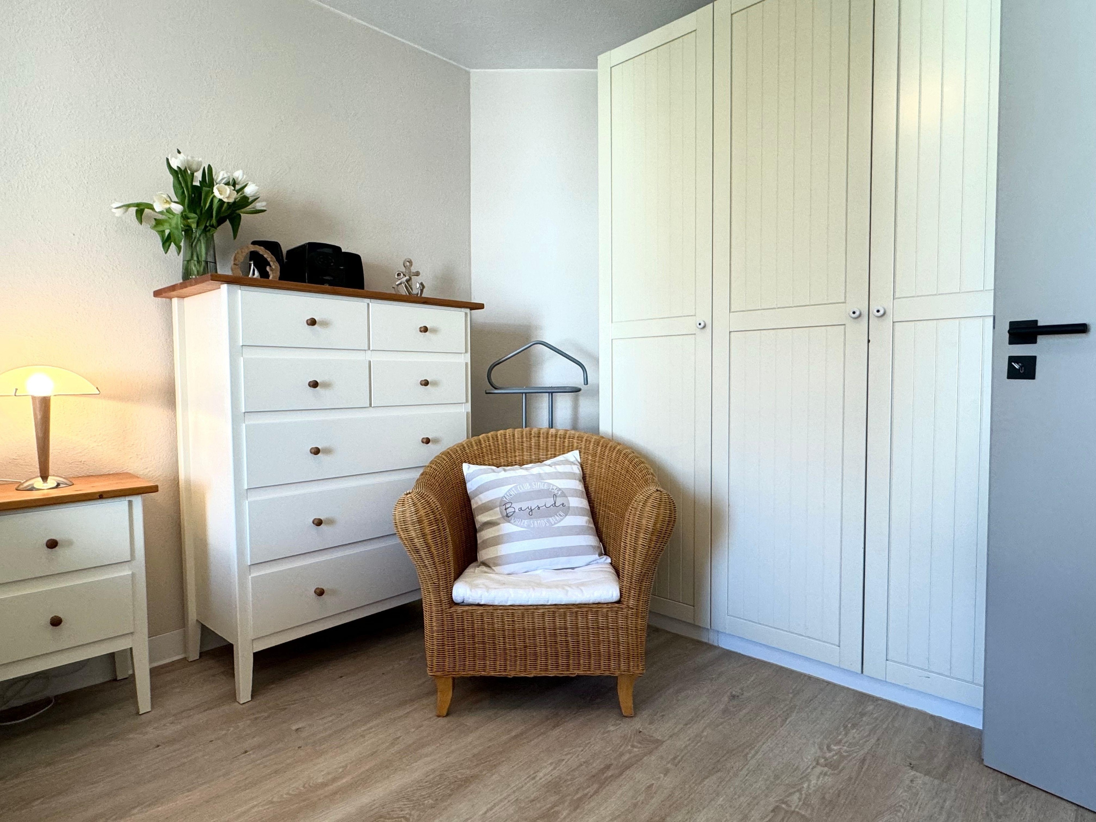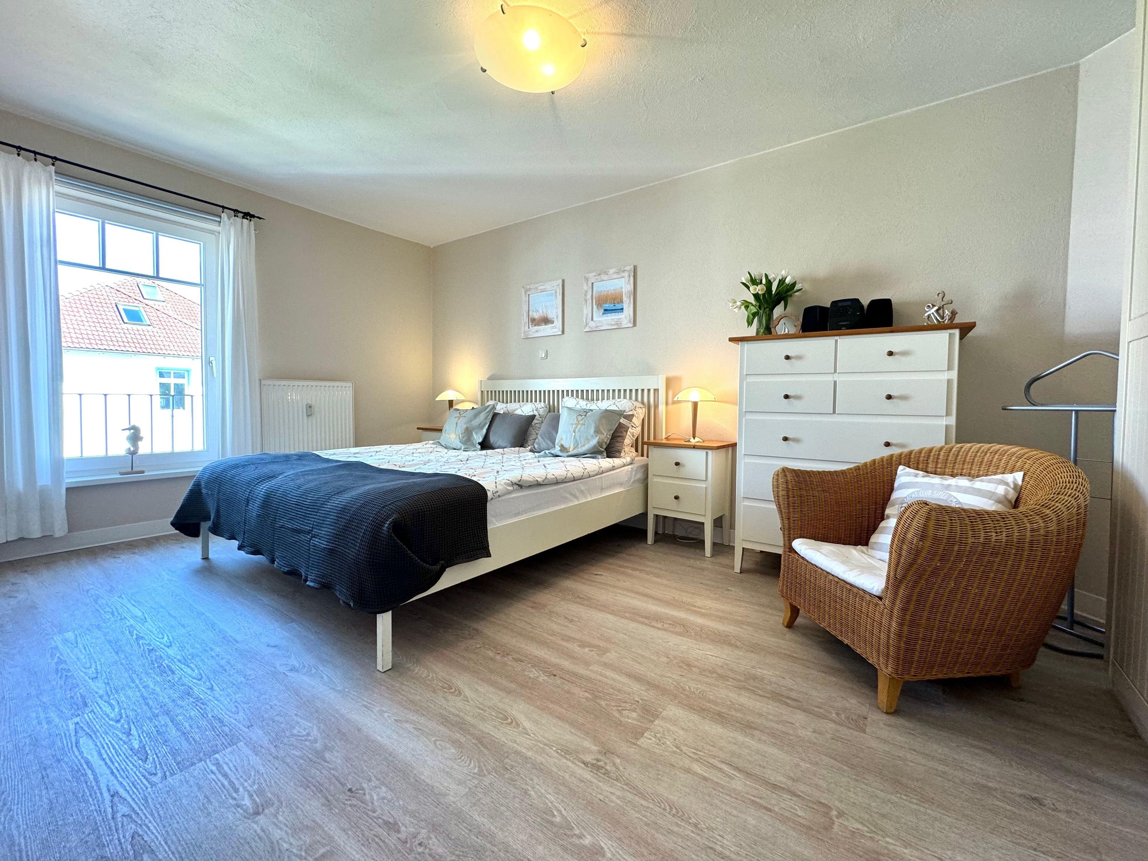 In dem geräumigen Schlafzimmer befindet sich ein großes Doppelbett sowie ein Kleiderschrank mit ausreichend Platz für Ihre Urlaubsgarderobe.