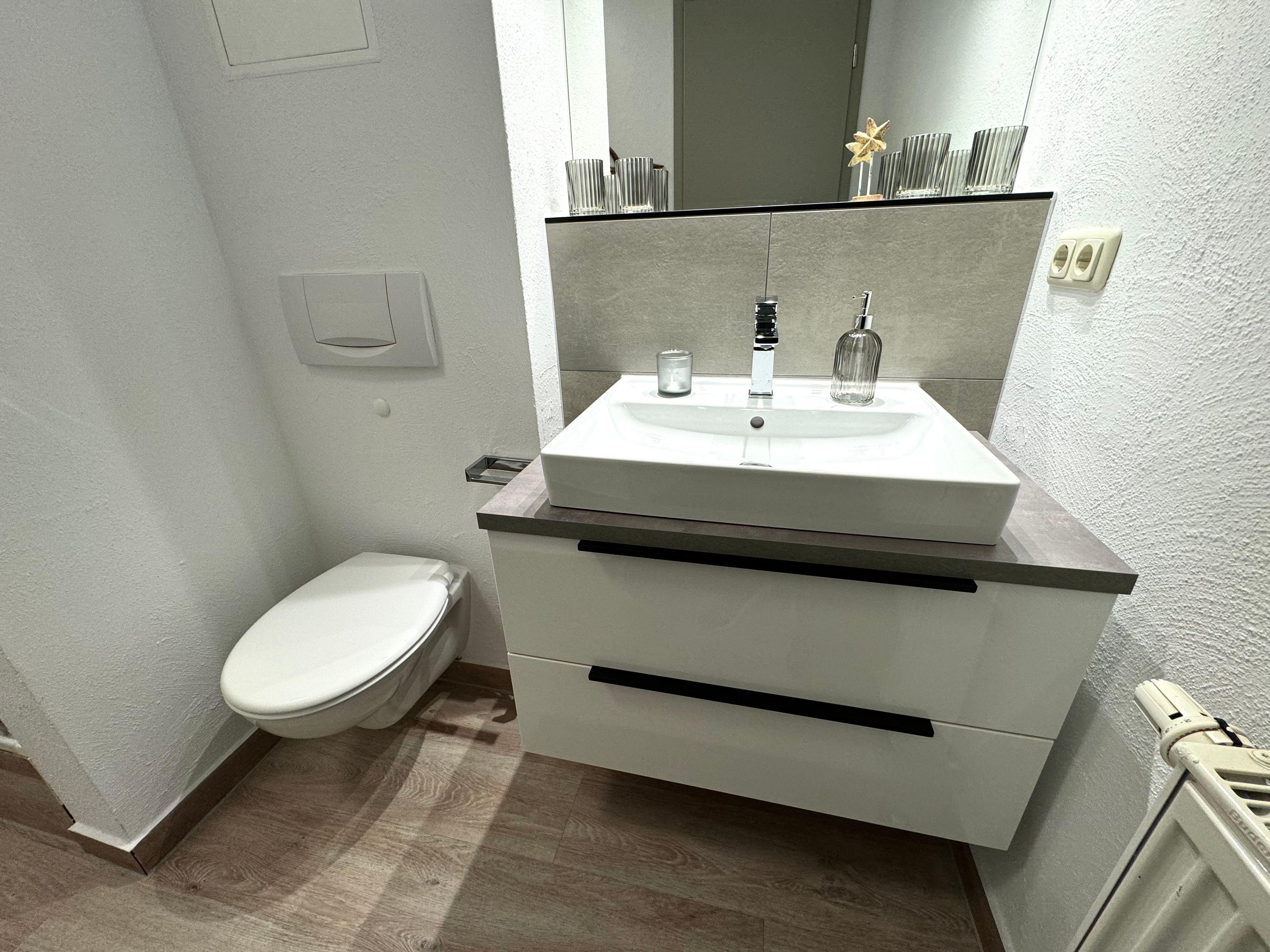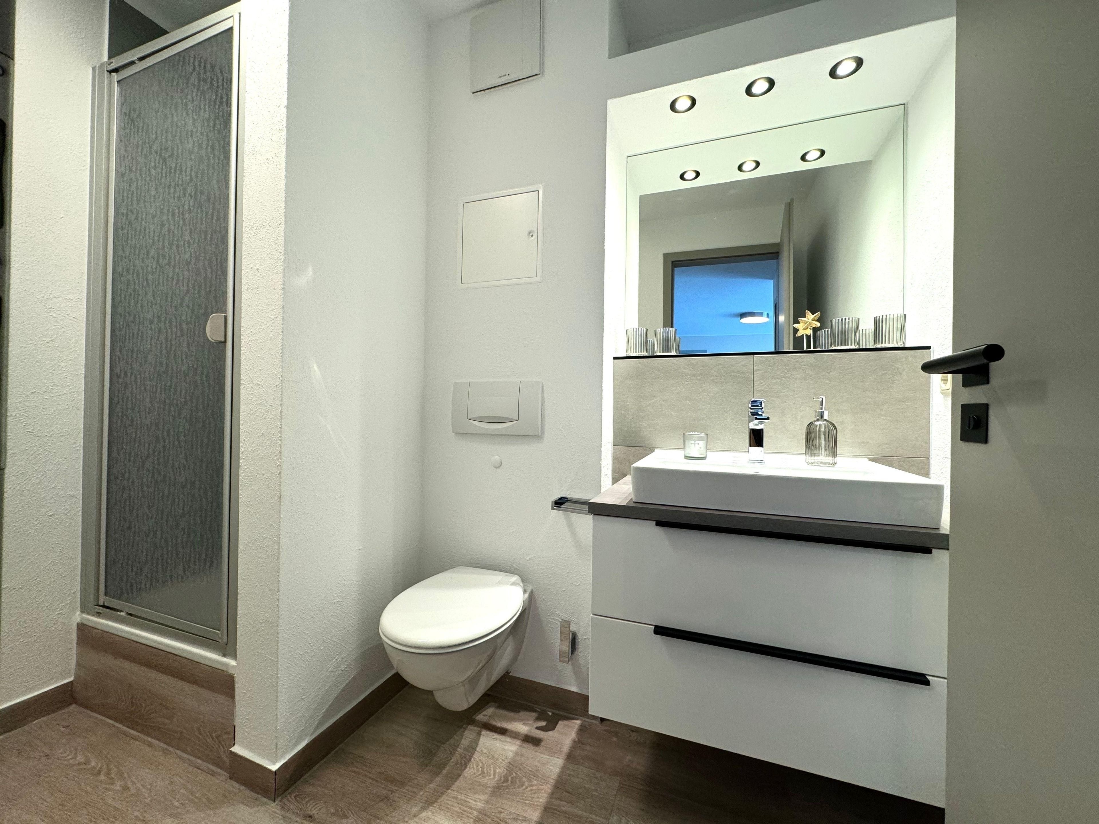 Das Bad ist mit einer Dusche, einem WC und einem Waschbecken mit Unterschrank ausgestattet. Hier können Sie frisch und munter in den Tag starten.