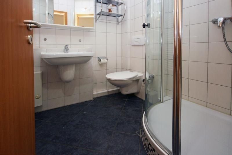 Das Badezimmer ist mit einer Dusche, einem Waschbecken und einem WC ausgestattet.