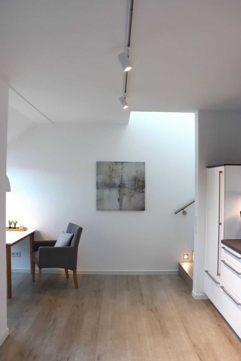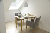 In der ersten Etage der Wohnung finden Sie den Wohnbereich mit Sofa und großem Fernseher (Smart-TV). Angrenzend befindet sich die hochwertige Einbauküche mit allen wichtigen Küchenutensilien und Geräten, wie bspw. Backofen, Herd, Mikrowelle, Kühlschrank mit Gefrierfach, Kaffeemaschine sowie ein Esstisch mit zwei bequemen Stühlen. Von hier aus können Sie auch auf die großzügige Loggia (Balkon) in Süd-West-Ausrichtung mit klappbaren Gartenmöbeln hinaustreten.
