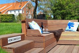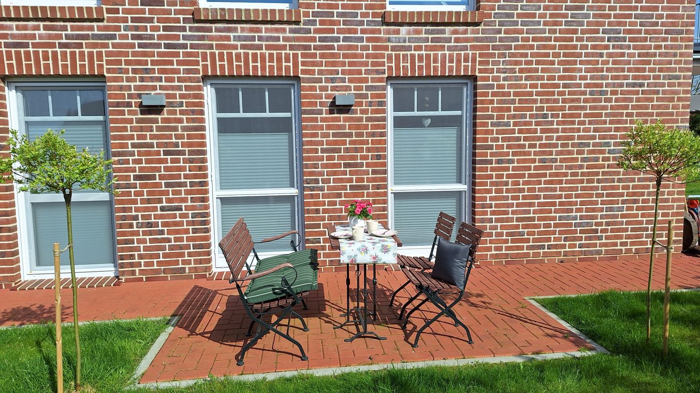 Der freie Blick auf den grünen Garten mit Grachtenzugang verspricht Urlaubsflair pur. Ostfriesisches Grachtenkino bietet dabei die direkt an den Wohnbereich angrenzende 25 m² große Terrasse, die ganztags wärmende Sonnenstrahlen verspricht. Gartenmöbel, Strandkorb und Elektrogrill sind vorhanden.