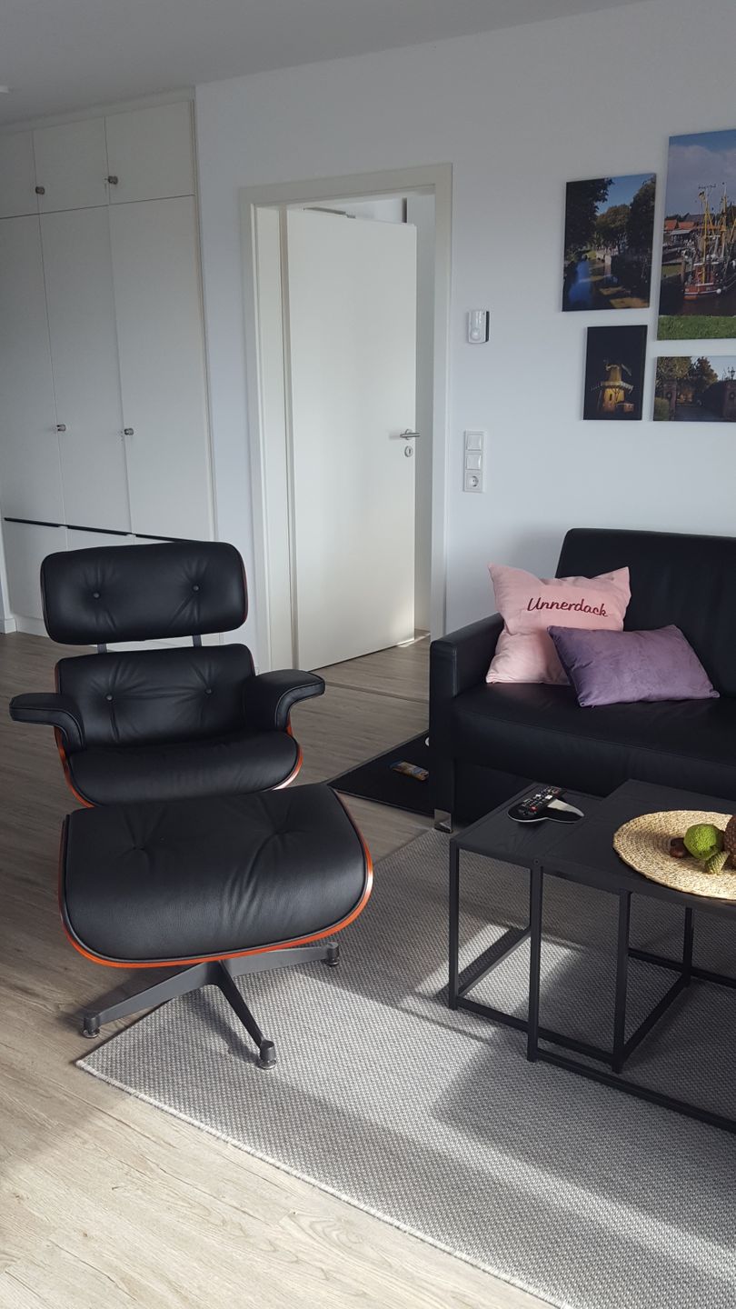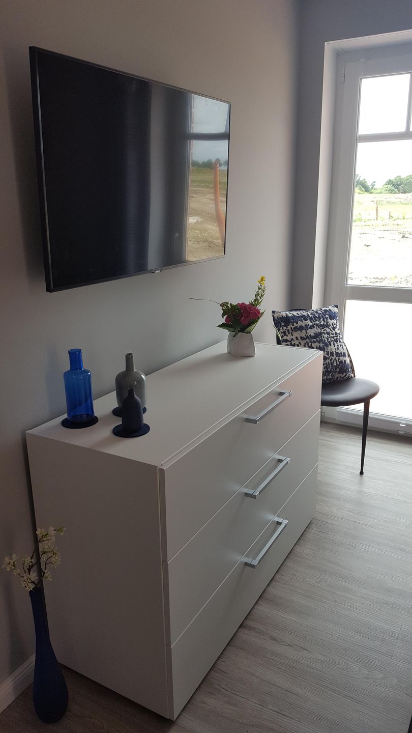 Die Ferienwohnung ist hochwertig ausgestattet und stilvoll mit einer Reihe moderner Möbel eingerichtet. Klare Formen, kräftige Farben und schlichte Materialien zeichnen den modernen Stil der Fewo Unnerdack aus und ermöglichen Ihnen einen erholsamen Rückzug vom täglichen Alltagstrubel. Sie bietet neben zwei Terrassen und ihrer ebenerdigen Beschaffenheit einen insgesamt barrierefreien Zugang. Der sehr helle und lichtdurchflutete Gesamteindruck entsteht aufgrund der durchgängig vorhandenen bodentiefen Fenster, die mit blickdichten Plissees und Überhängen ausgestattet sind. Fußbodenheizung ist in allen Räumen vorhanden. Der komplette Fußboden ist mit Vinyl bedeckt. Die beiden Schlafräume haben elektrische Außenrollos, so dass Sie auch im Schlaf nicht zu früh durch die Helligkeit aufgeweckt werden.