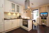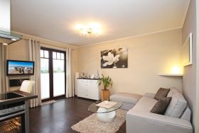 Die Ferienwohnung ist komfortabel und stilvoll eingerichtet und befindet sich im Erdgeschoss des Hauses 4 mit einer nach Süd/West ausgerichteten, sonnigen Terrasse. Der Fußboden ist mit hochwertigem Linoleum in Dielenoptik ausgelegt.