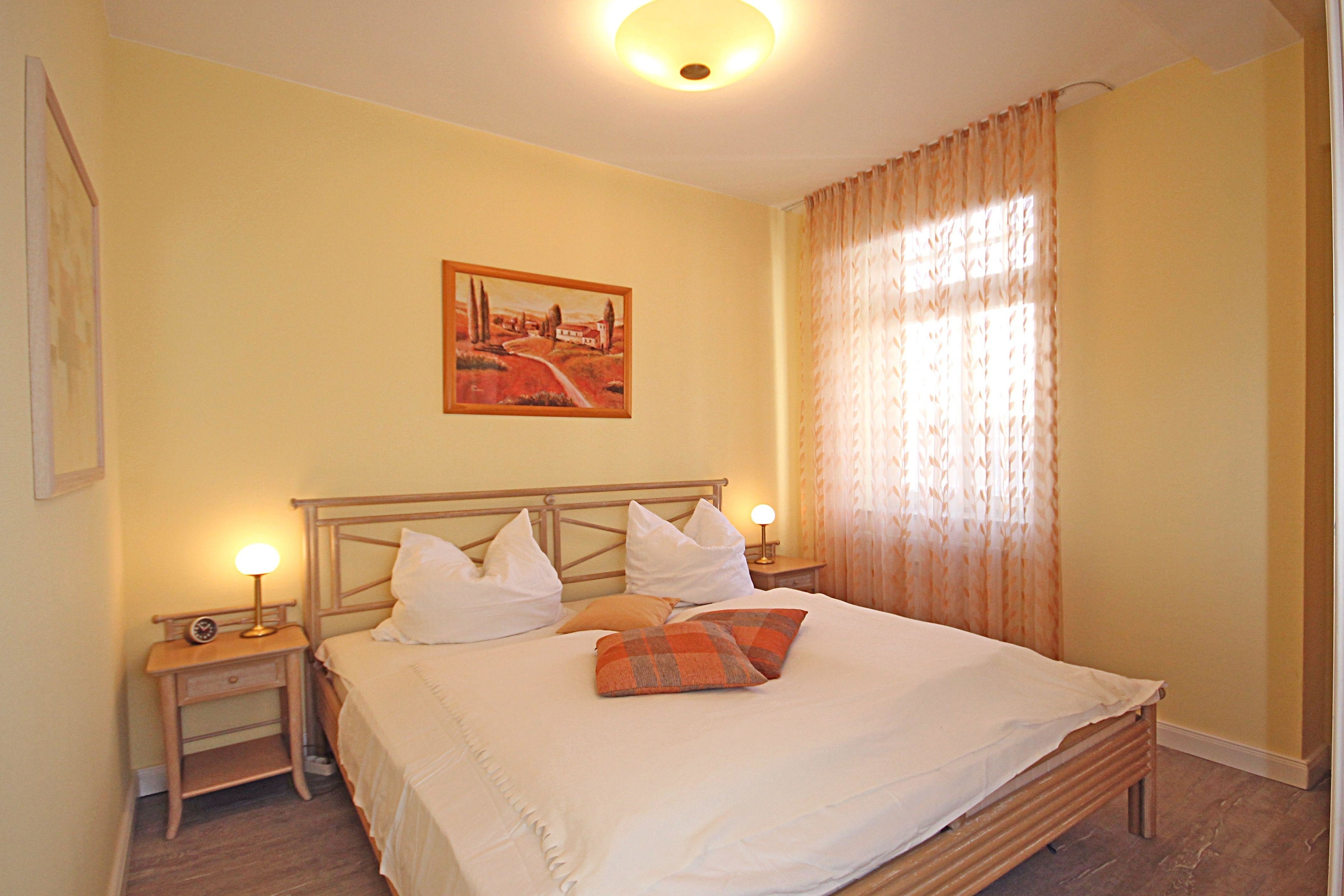 Das Schlafzimmer ist mit einem bequemen Doppelbett und geräumigem Kleiderschrank für Ihre Urlaubsgarderobe ausgestattet.