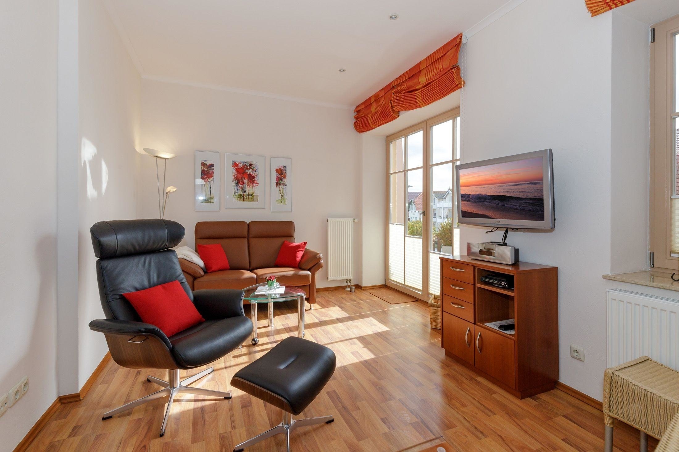 Die Wohnung ist im 1. Obergeschoss gelegen und bequem mit dem Fahrstuhl oder über das Treppenhaus zu erreichen. Sie bietet einen Wohnbereich, ausgestattet mit einem gemütlichen Sofa, einem Sessel, einem Relax-Sessel, einem Kabel-TV-Flachbildschirm, einem Radio mit USB / I-Pod Anschluss und CD Player sowie einem DVD Player.
