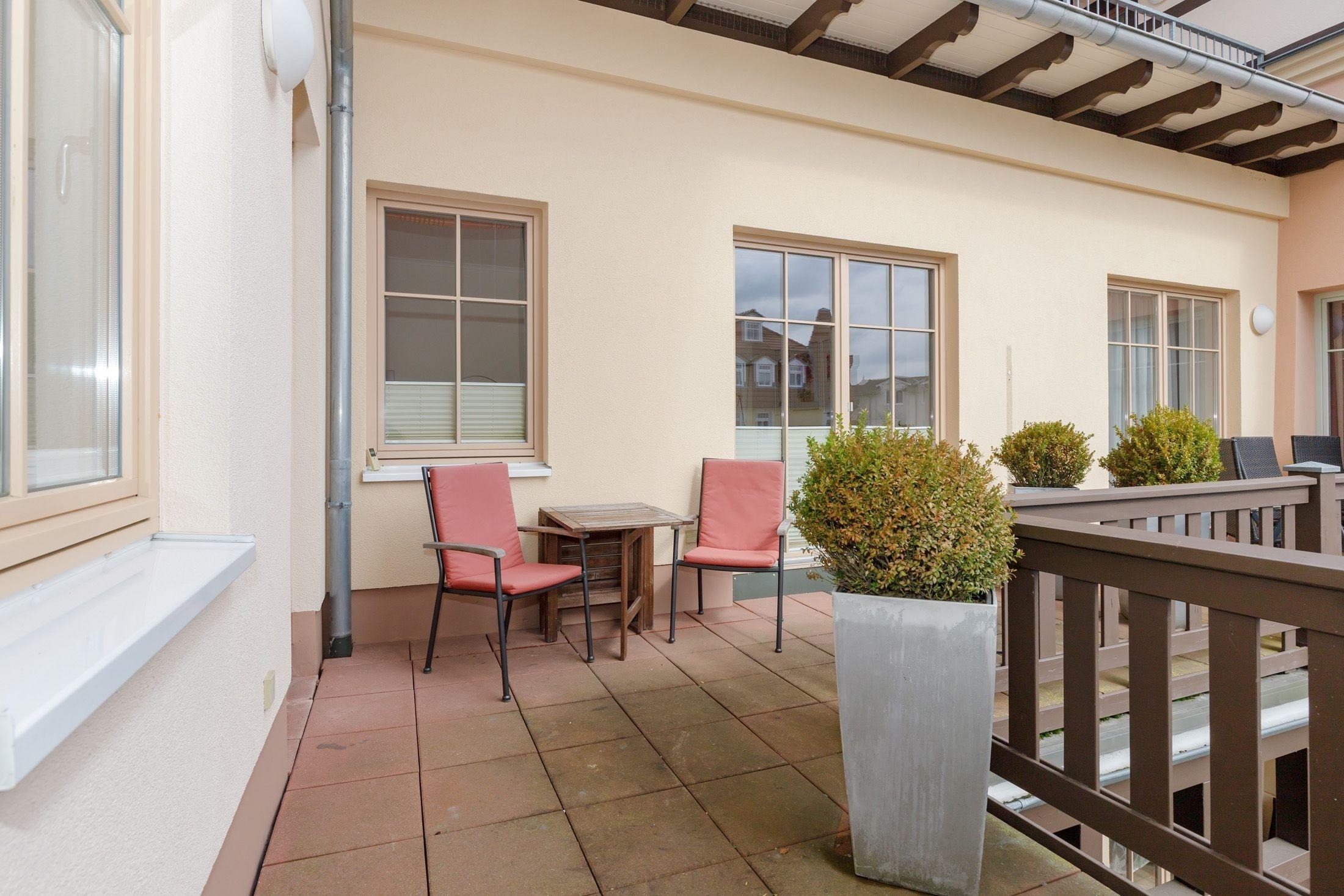 Auf dem mit hübschen Möbeln und großen Blumenkübeln ausgestatteten 15 m² großen Eckbalkon in