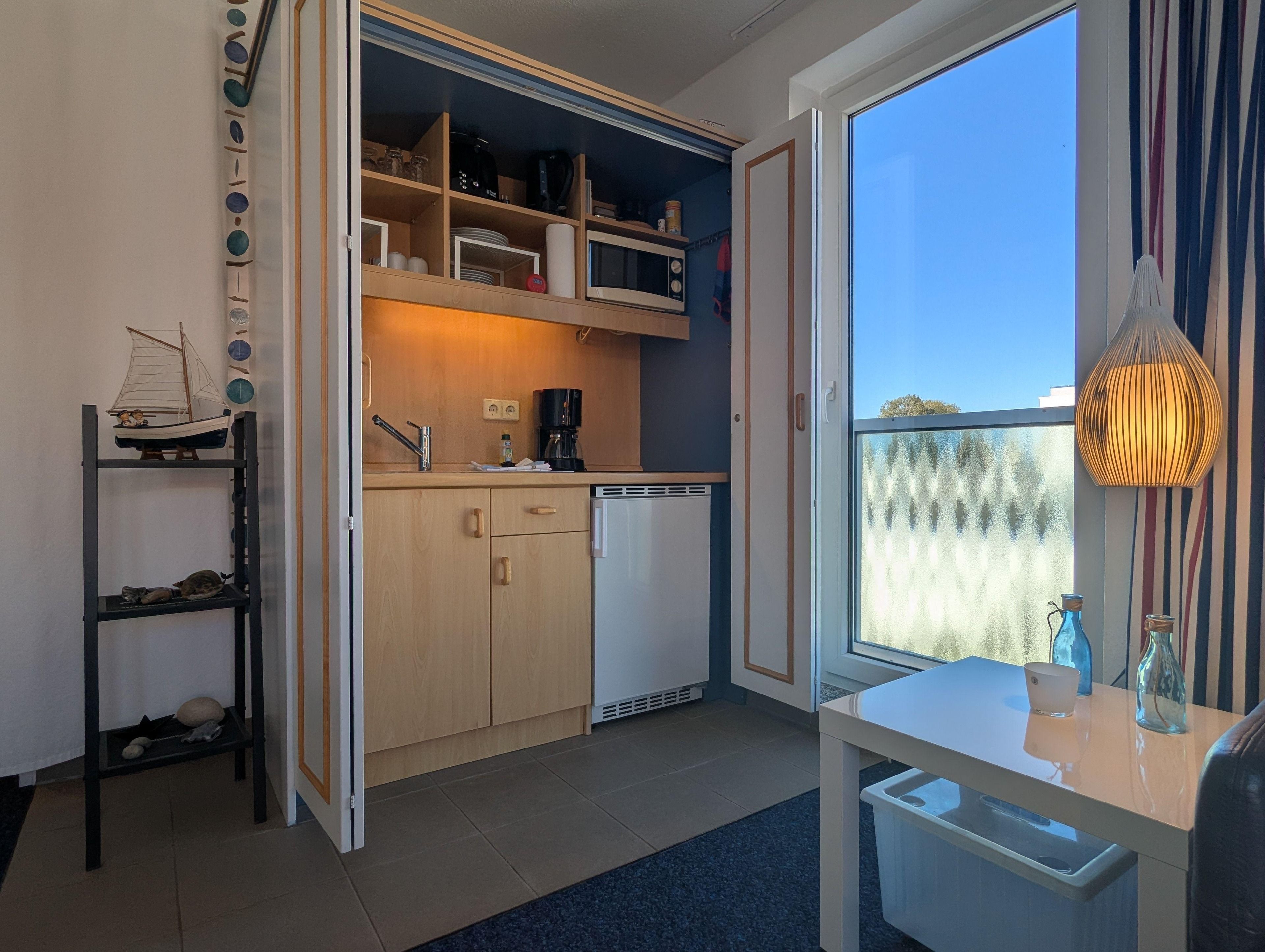 Falls Sie nicht Essen gehen möchten, nutzen Sie die Pantry-Küche, die mit einem 2-Platten-Kochherd, Mikrowelle mit Grill, Kühlschrank, Toaster, Kaffeemaschine, Wasserkocher und natürlich genügend Geschirr ausgestattet ist. Mit zwei Handgriffen ist die kleine Küche in einen Schrank verwandelt.