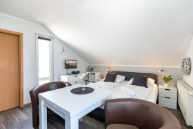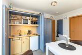 An den Wohn-Schlafbereich grenzt die kleine, voll ausgestattete Küchenzeile, die Ihnen alle Bequemlichkeiten einer modernen Küche bietet.