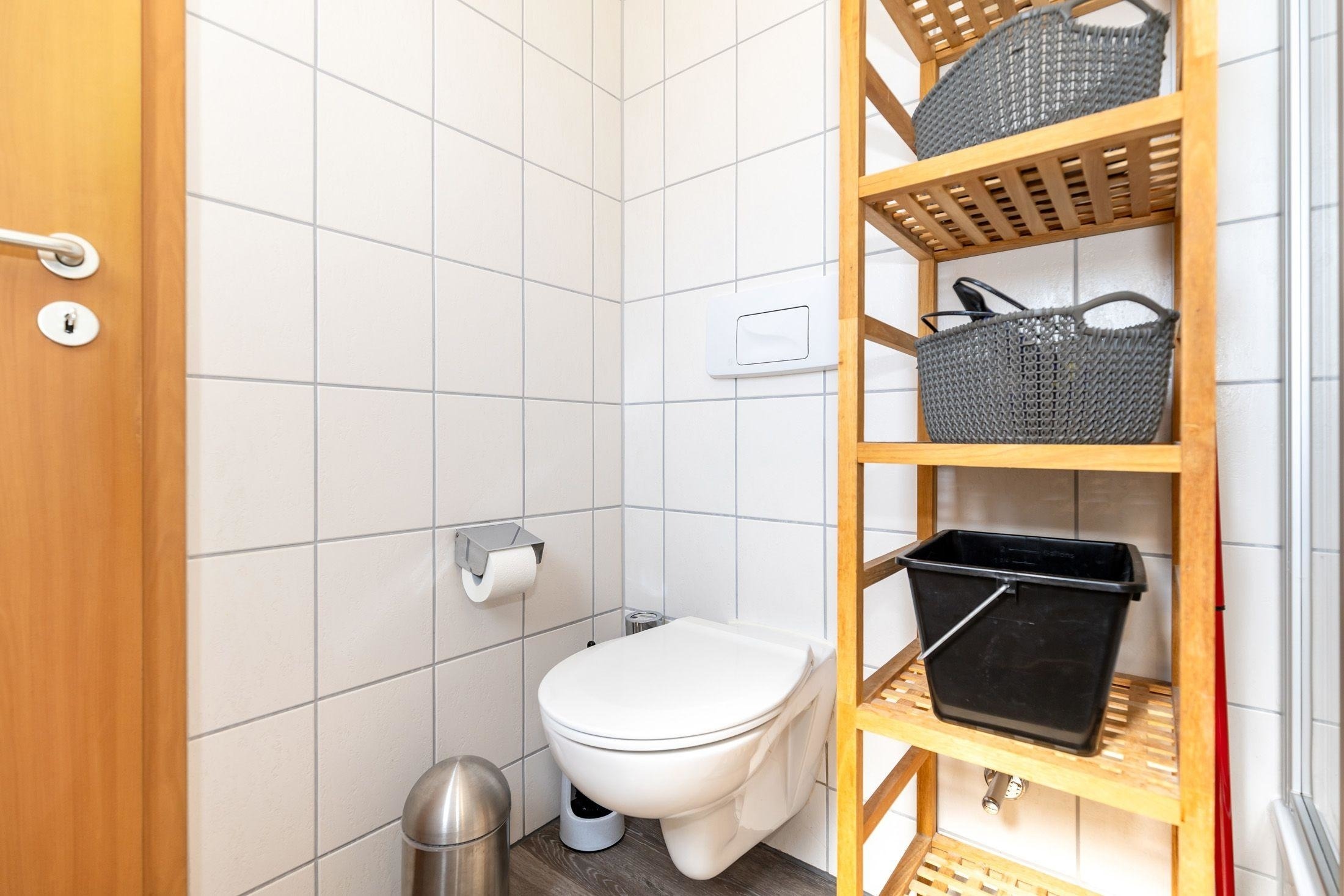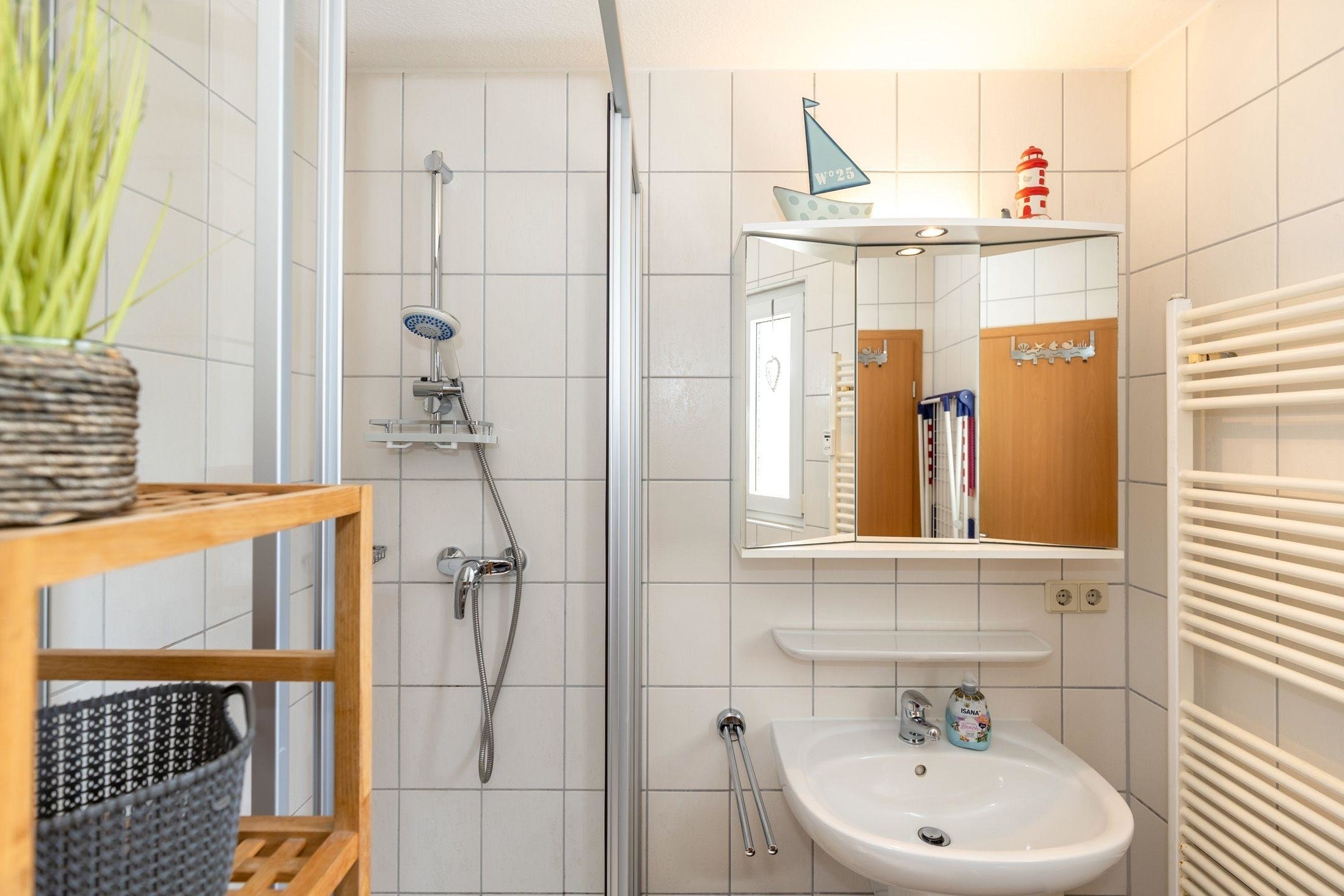 Das Badezimmer ist mit einer Dusche , einem Waschbecken und einem WC ausgestattet.