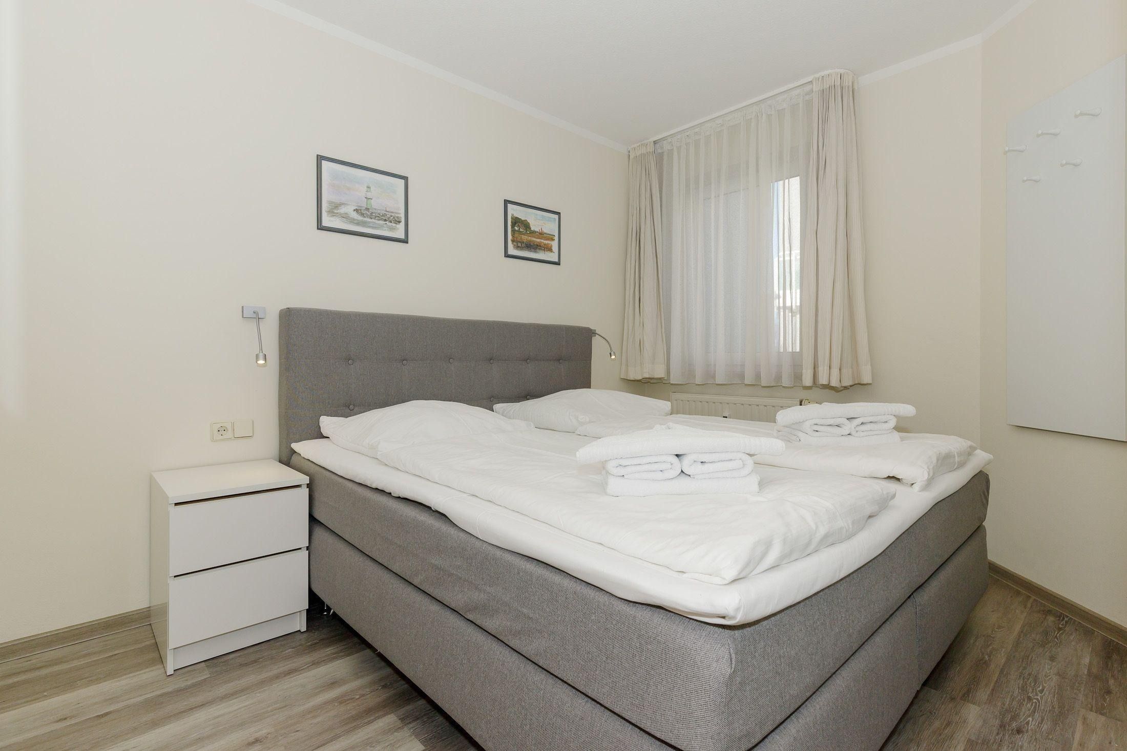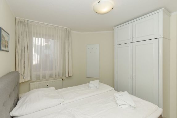 Das separate Schlafzimmer ist mit einem komfortablen Doppelbett eingerichtet. Für Ihre Urlaubsgarderobe steht Ihnen ein geräumiger Kleiderschrank zur Verfügung.