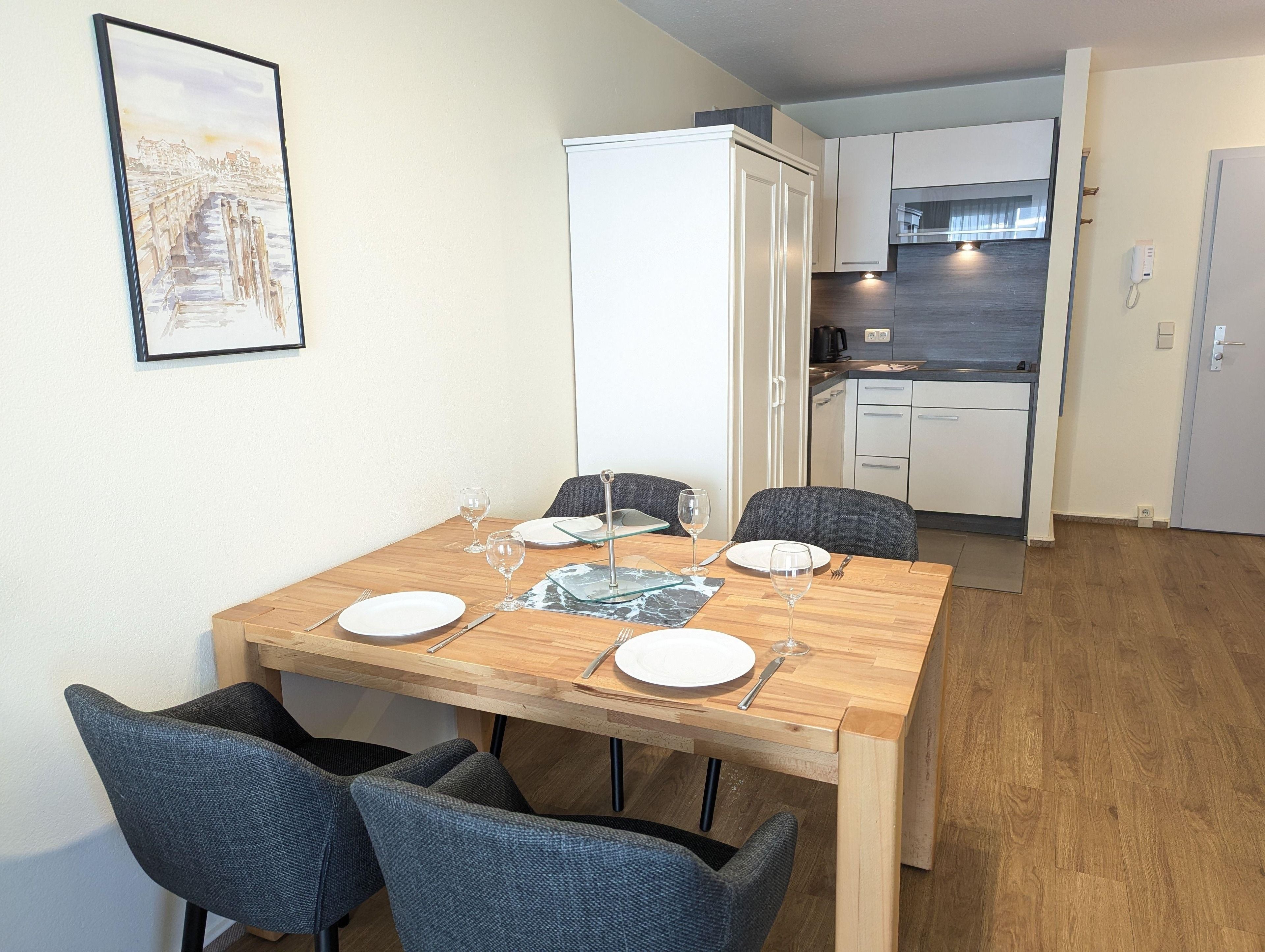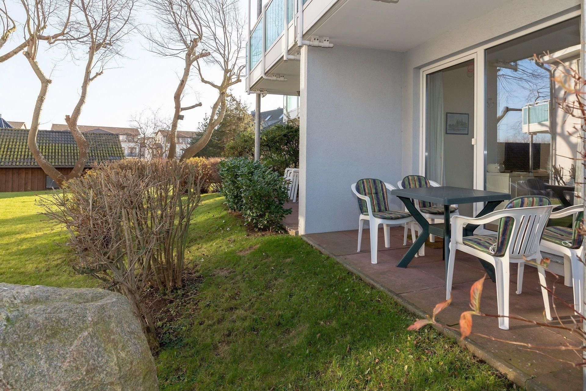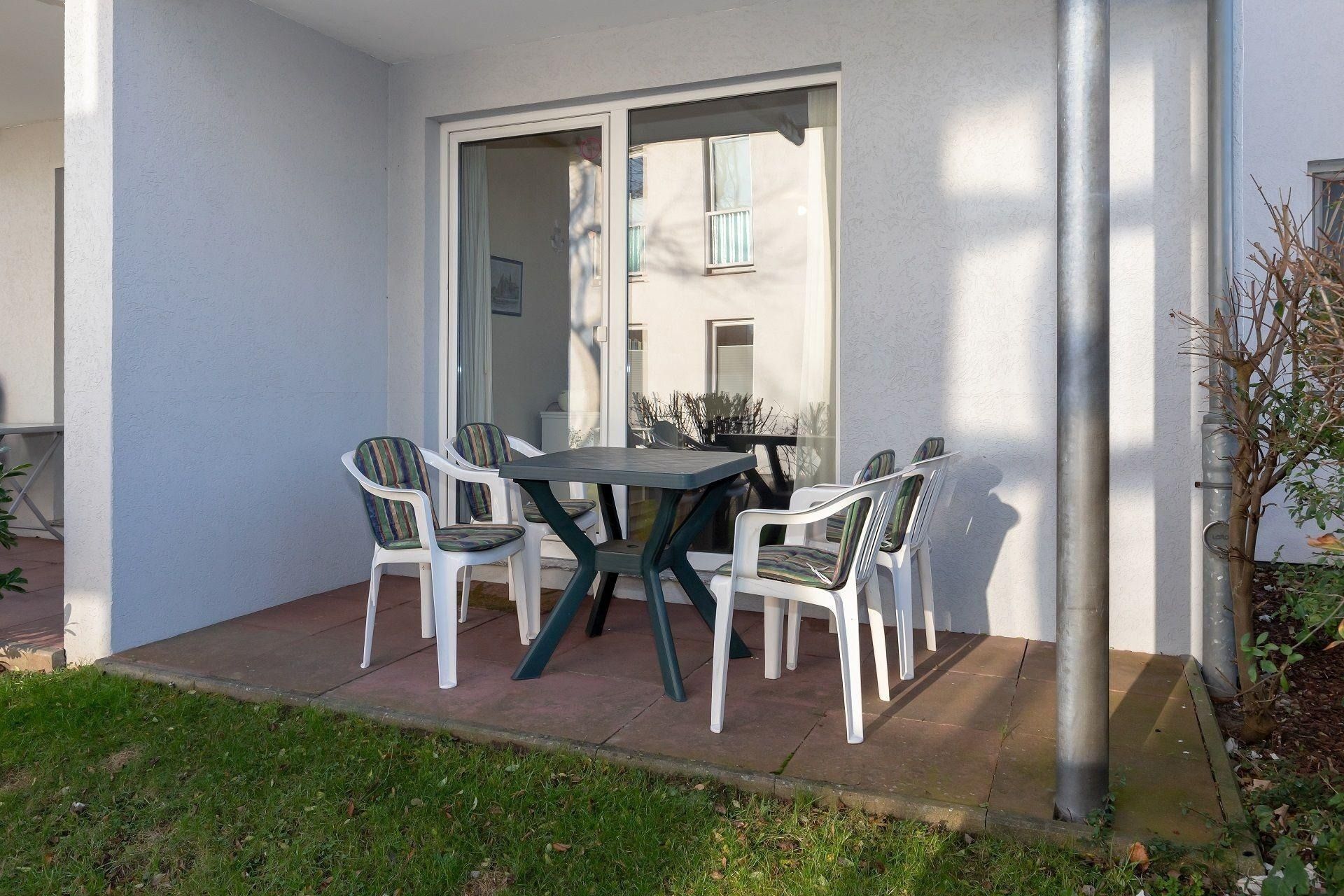 An Ihre Wohnung grenzt eine windgeschützte, mit Gartenmöbeln ausgestattete Terrasse zur Nordseite, welche Sie direkt von Ihrem Wohnzimmer aus betreten können.