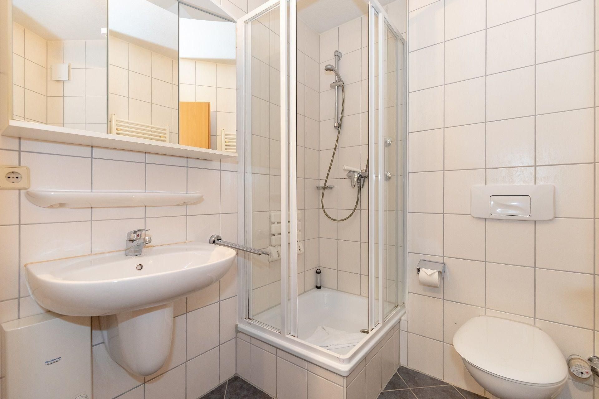Das Badezimmer ist mit einer Dusche, einem Waschbecken, einem Handtuchheizkörper und einem WC ausgestattet.