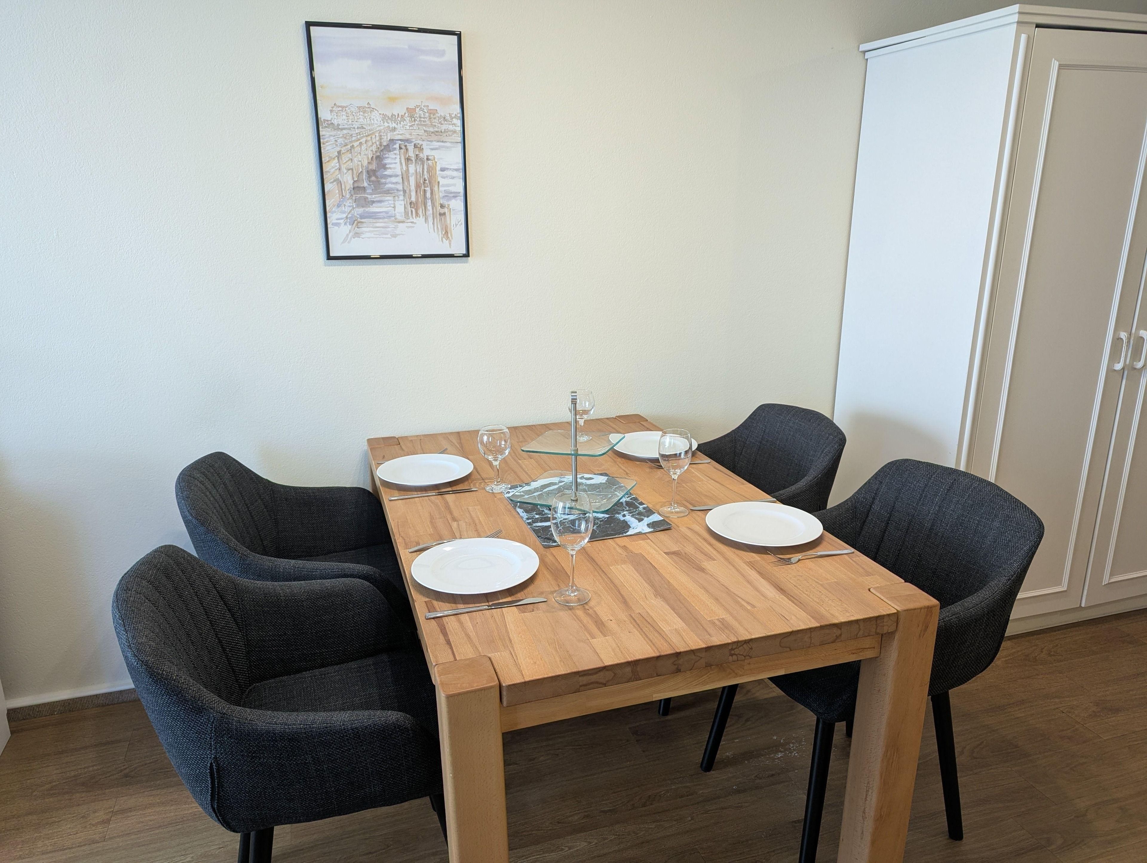 Am Esstisch mit 4 Stühlen finden alle Familienmitglieder Platz für die gemeinsamen Mahlzeiten.