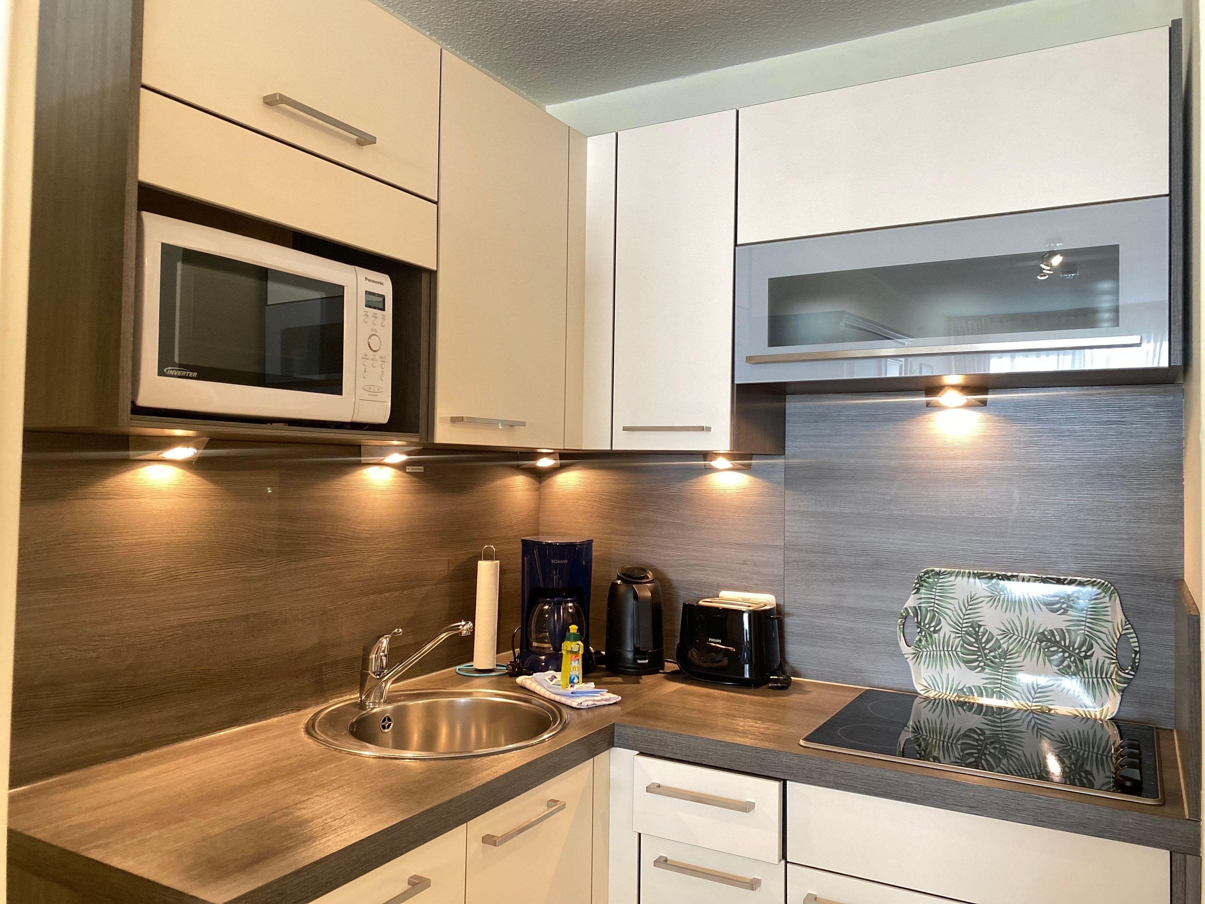 An den Wohnbereich grenzt die Küchenzeile, welche hochwertig ausgestattet ist. Hier stehen Ihnen alle Bequemlichkeiten einer modernen Küche zur Verfügung.