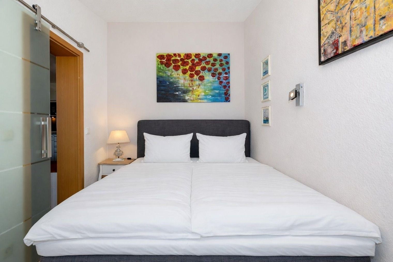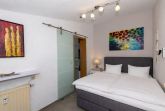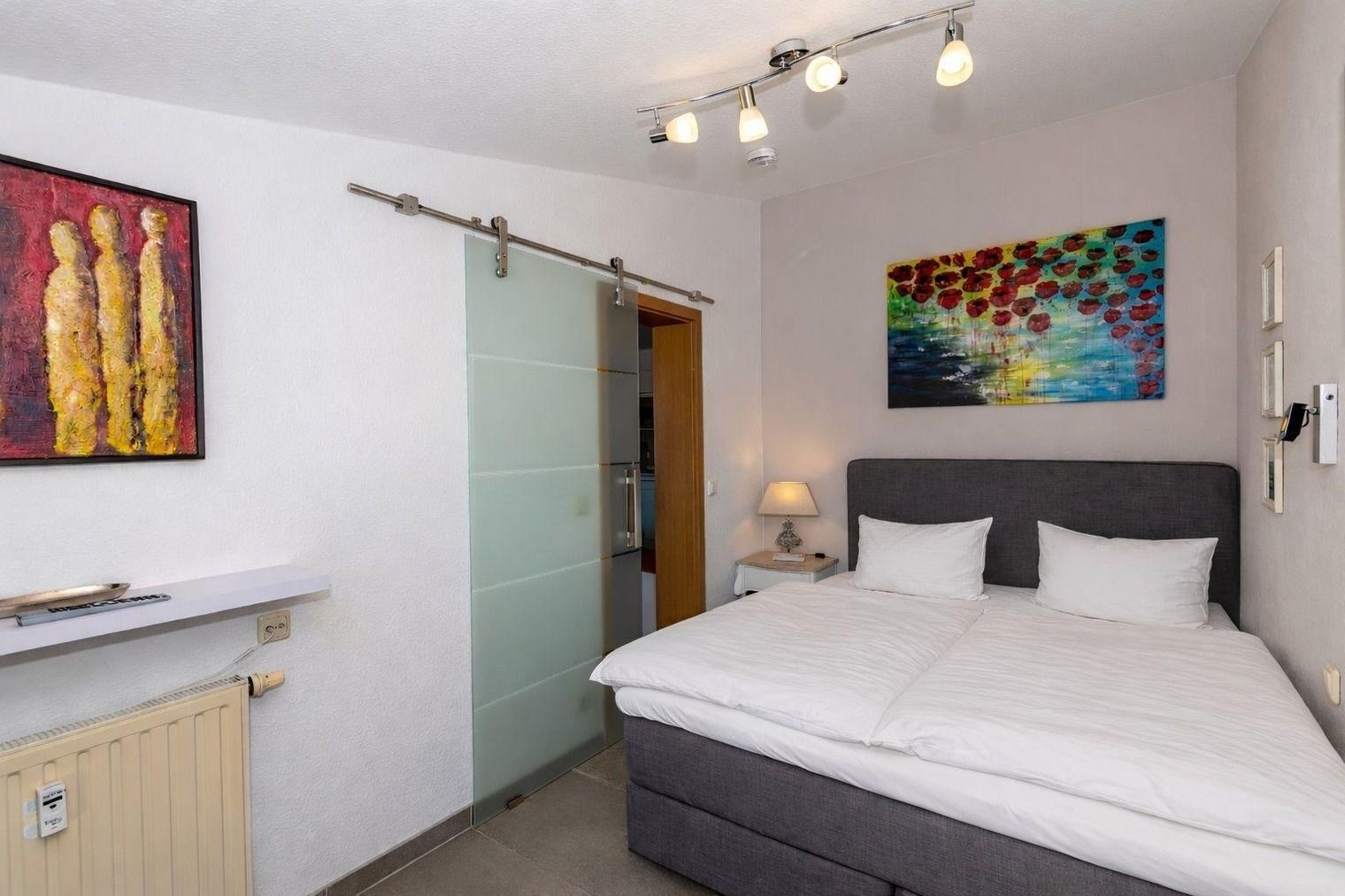 Das separate Schlafzimmer ist mit einem bequemen Doppelbett eingerichtet. Ein geräumiger Kleiderschrank sorgt für die Unterbringung Ihrer Urlaubsgarderobe. Ein hübscher Sekretär rundet das gemütliche Ambiente in diesem Bereich ab.