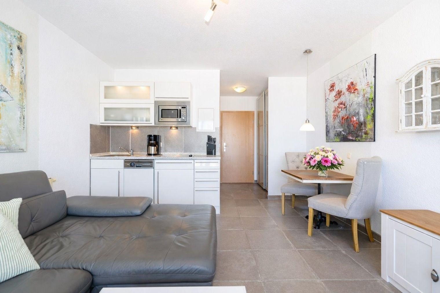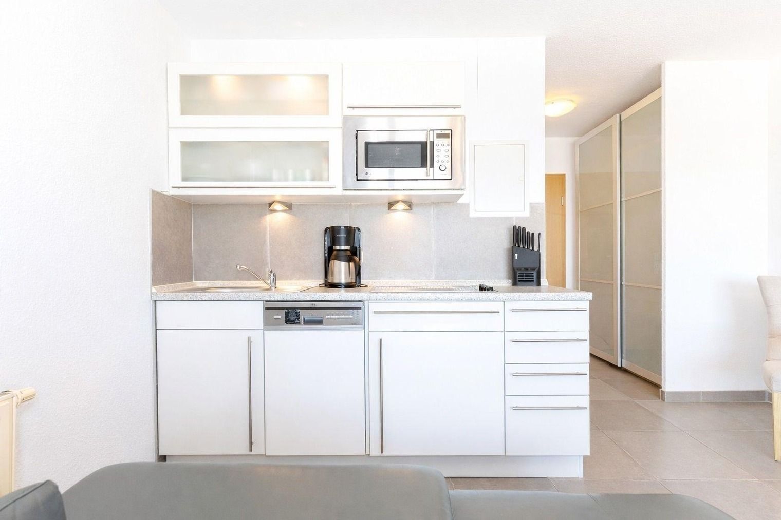 An den Wohnbereich grenzt die kleine, voll ausgestattete Küchenzeile, hier müssen Sie für die Zubereitung Ihrer Mahlzeiten auf nichts verzichten. Diese können Sie bequem am vorhandenen Esstisch einnehmen.