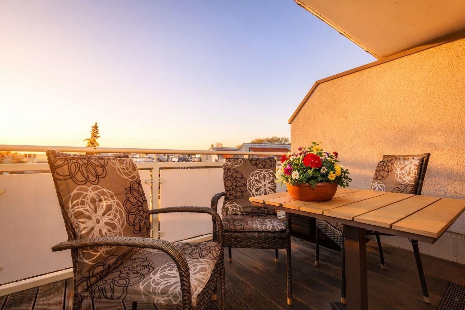 ein großzügiger Balkon mit modernen Balkonmöbeln lädt zum Entspannen ein. Hier können Sie die Seele baumeln lassen und am Abend gemeinsam einen ereignisreichen Tag bei einem leckeren Getränk Revue passieren lassen.