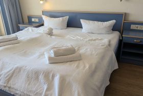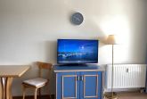 Der kleine Wohn-/Schlafbereich ist mit einem großen, bequemen Doppelbett und einer kleinen Essecke eingerichtet. In dieser kleinen Wohlfühloase können Sie Ihre Urlaubstage in vollen Zügen genießen. Für Ihre abendliche Unterhaltung sorgt ein Flachbildschirm-Gerät.