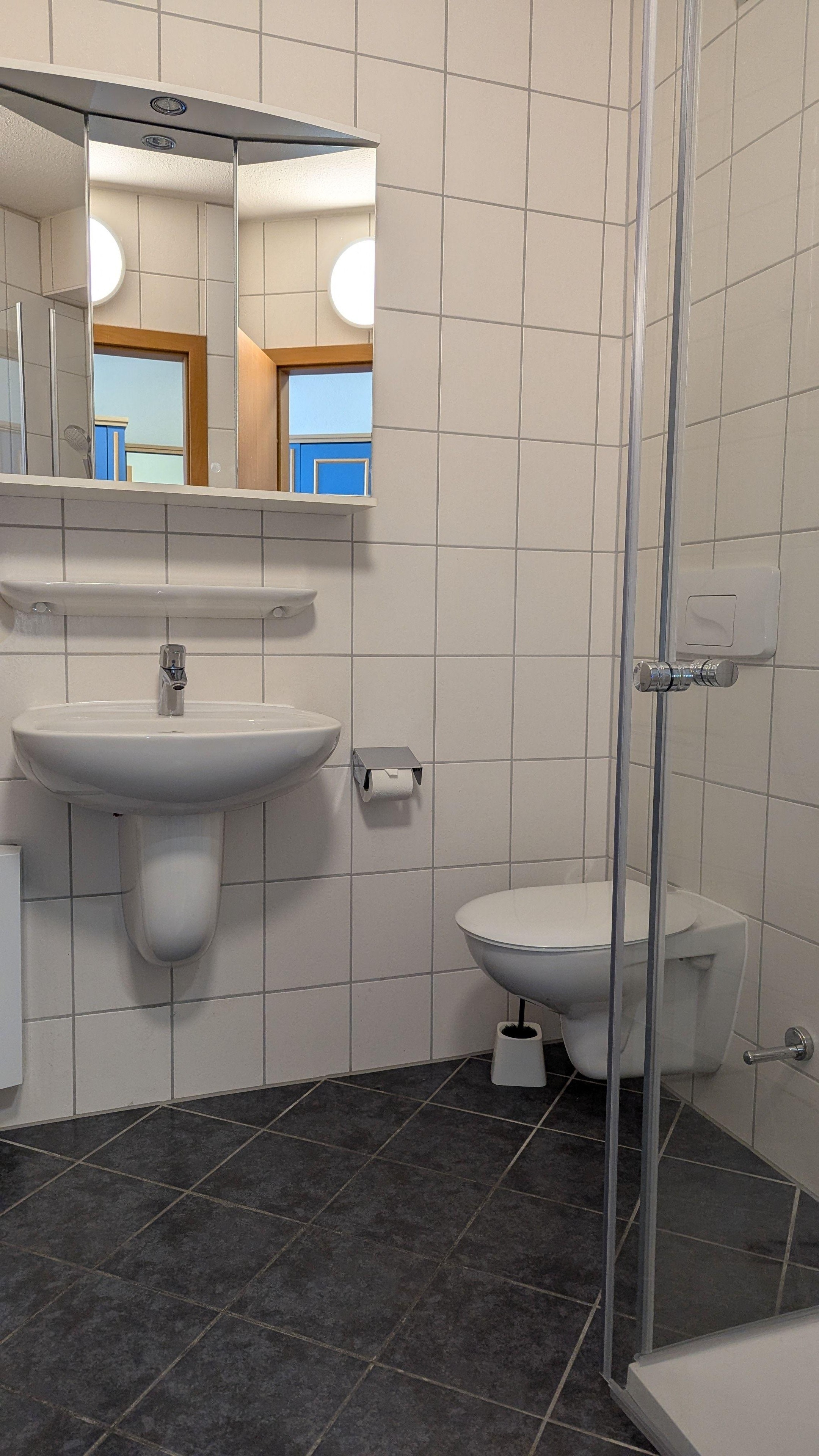 Das Badezimmer verfügt über eine Dusche, ein Waschbecken und ein WC.