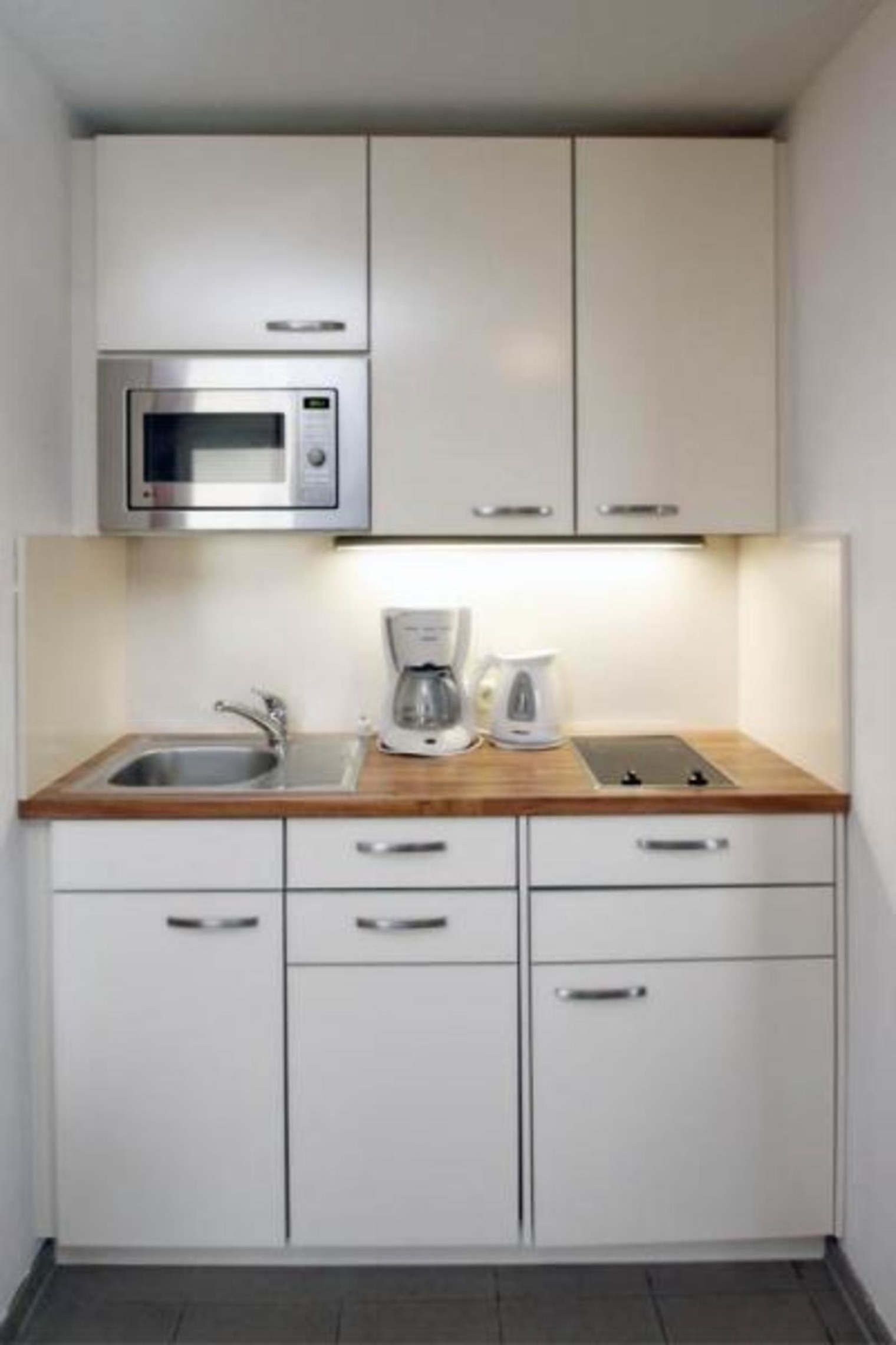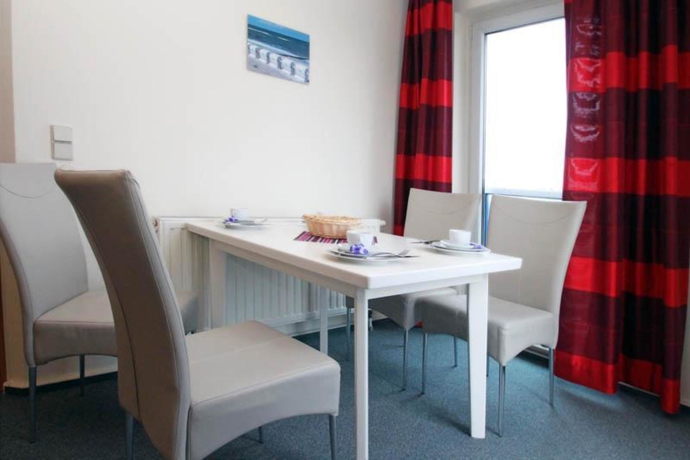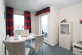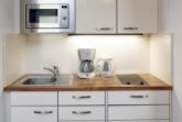An den Wohnbereich grenzt die kleine Küchenzeile, welche voll ausgestattet ist. Hier finden Sie alle Bequemlichkeiten einer modernen Küche. Schnell sind Ihre Lieblingsmahlzeiten zubereitet, die am vorhandenen Esstisch mit 4 Stühlen eingenommen werden können.