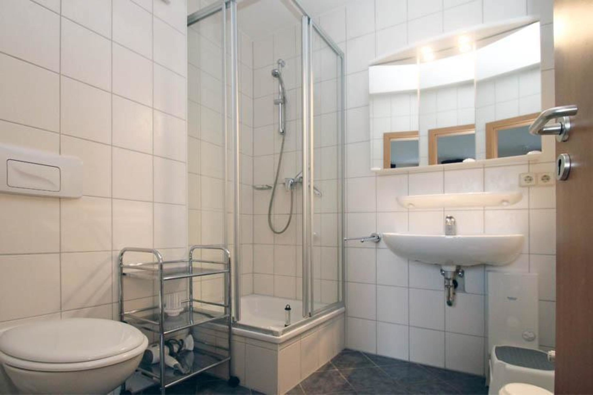Das Badezimmer ist mit einer Dusche, einem Waschbecken und WC ausgestattet. Hier finden Sie auch einen Föhn.