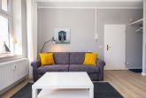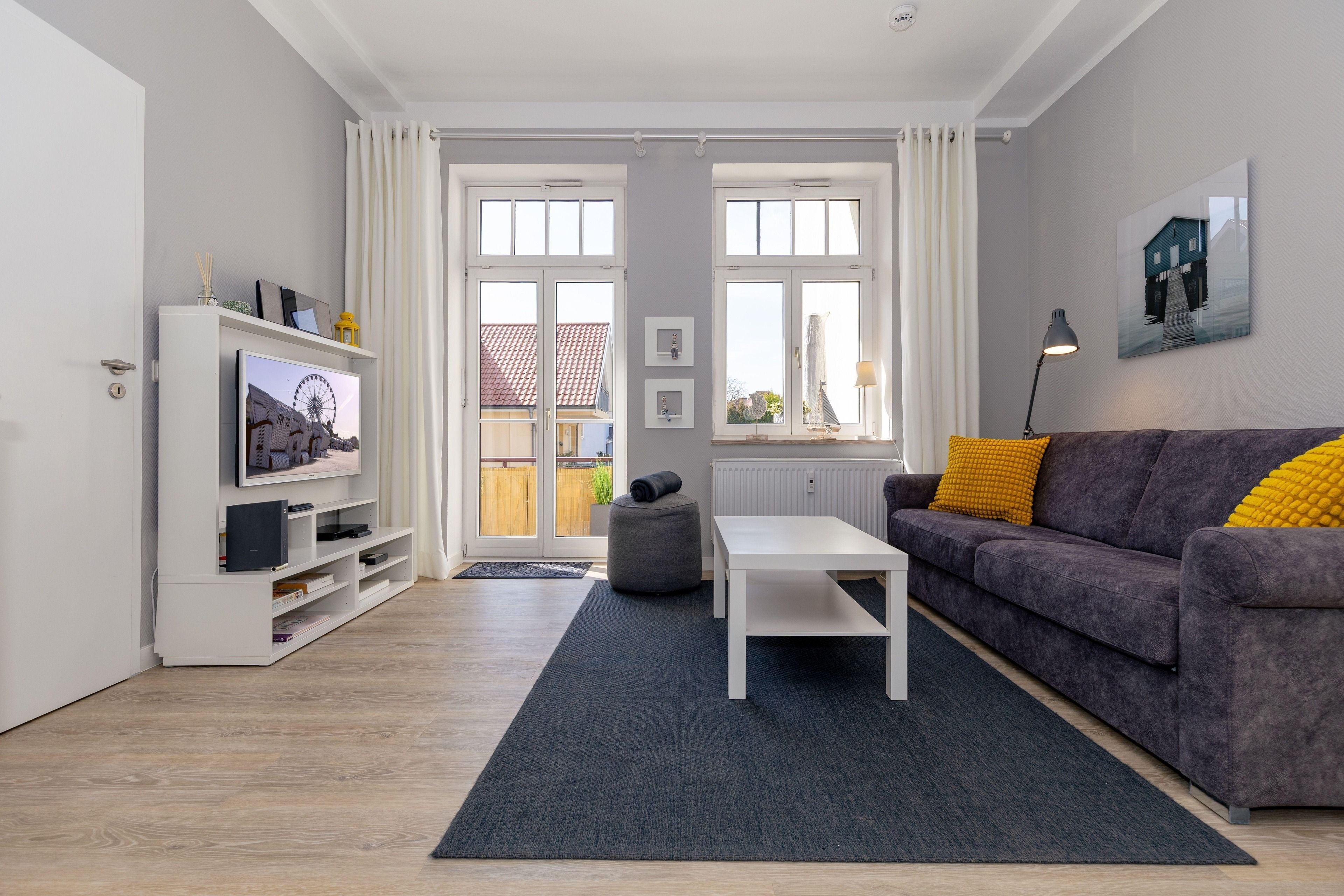 Der Wärme und Komfort ausstrahlende Wohnbereich ist mit einer modernen Couchgarnitur ausgestattet und hält für Ihre Unterhaltung einen Flachbildfernseher und einige Bücher bereit. Von hier aus gelangen Sie auch auf den großen Südbalkon.