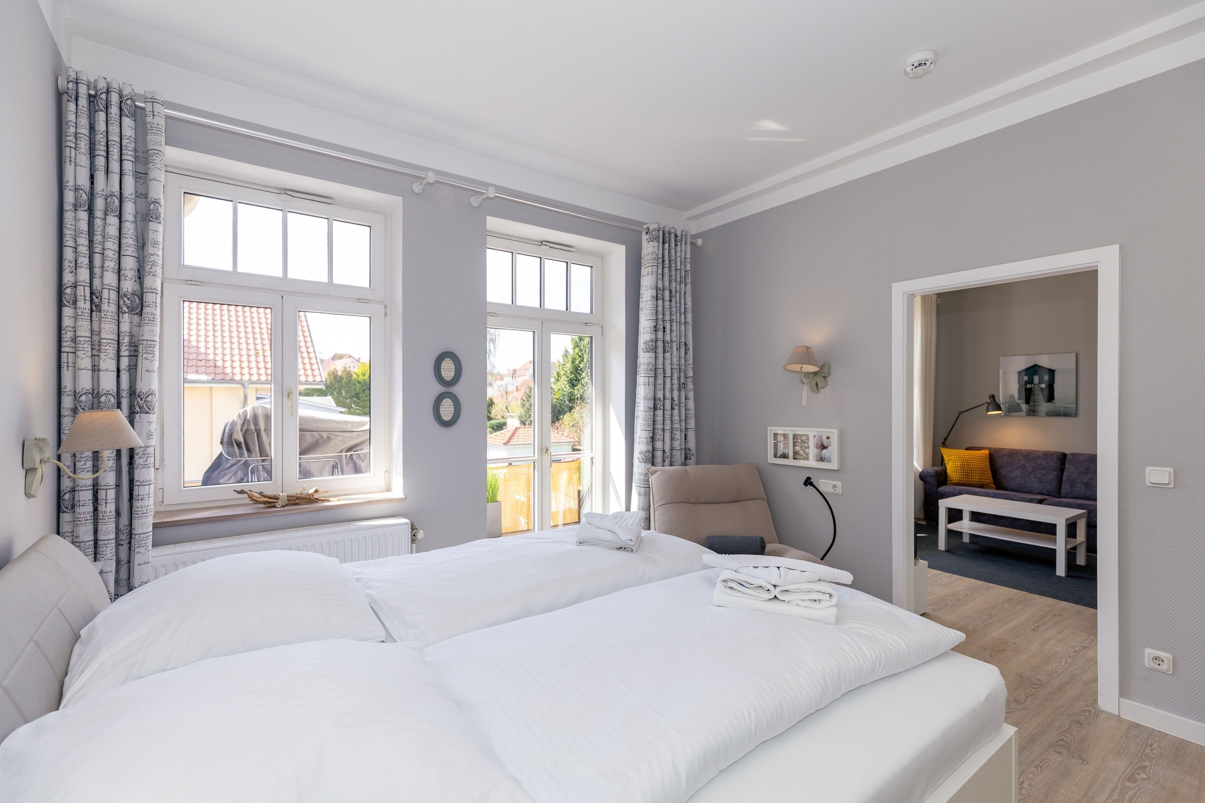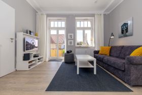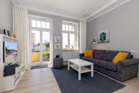 Die im gleichen Haus befindliche “Classic Conditorei & Café Röntgen“ bietet Ihnen die Möglichkeit, ein reichhaltiges Frühstück zu sich zu nehmen oder Sie beginnen Ihren Tag mit frischen Brötchen und heißem Kaffee auf dem großzügigen Süd-Balkon des Apartments, den Sie sowohl vom Wohn- als auch vom Schlafzimmer aus erreichen können. Moderne Balkonmöbel laden zum Sonnenbaden und Relaxen ein, für das Ostsee-Flair sorgt ein hübscher Strandkorb.