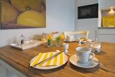Angrenzend befindet sich der offene Ess-/Küchenbereich. Dieser umfasst einen Esstisch für die gemeinsamen Mahlzeiten sowie die voll ausgestattete Küche mit allen technischen Geräte und Küchenutensilien des täglichen Bedarfs. Neben einer gängigen Filterkaffeemaschine ist auch eine Senseo-Kaffeemaschine vorhanden, die nur mit Kaffee-Pads funktioniert.