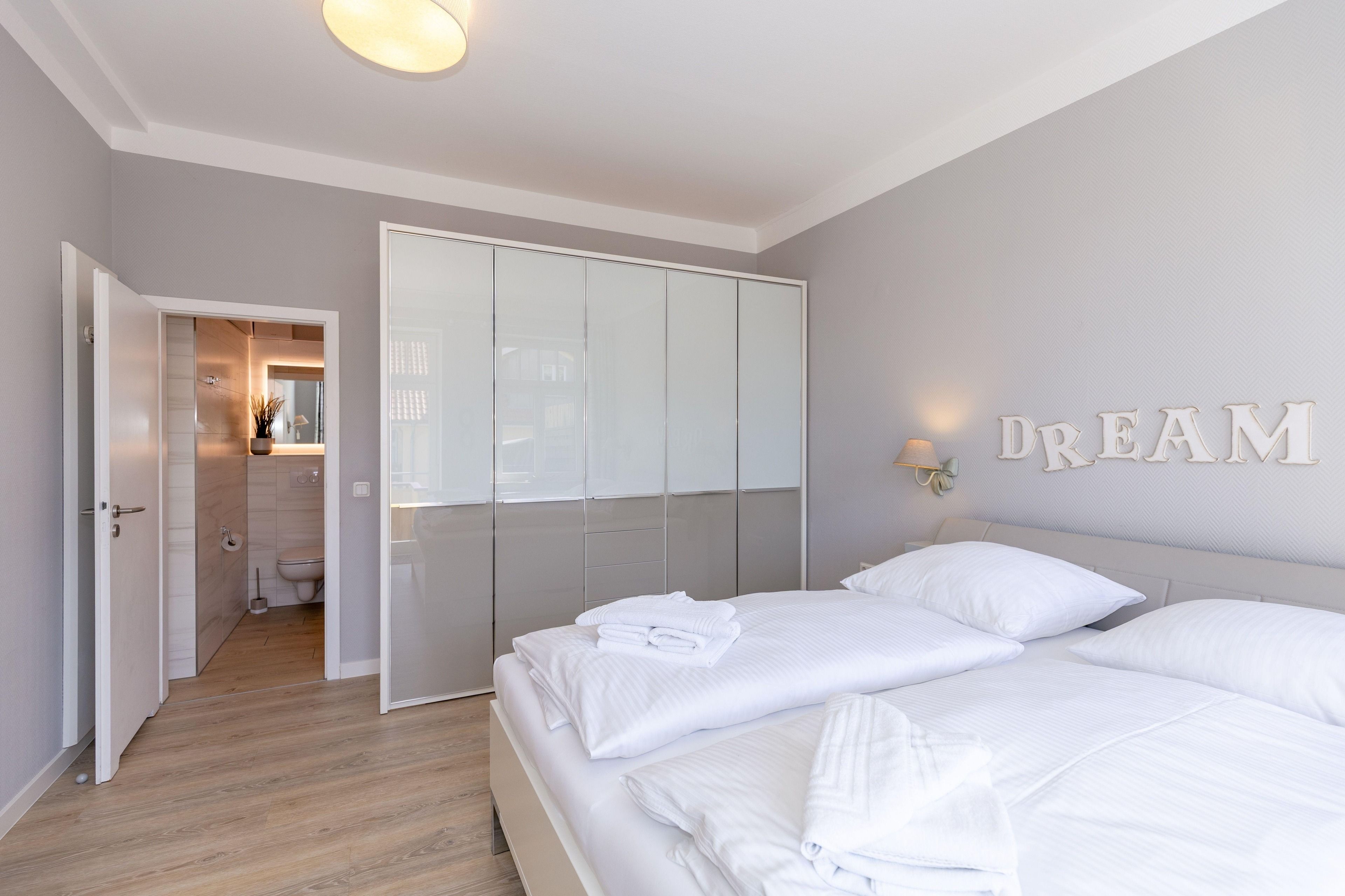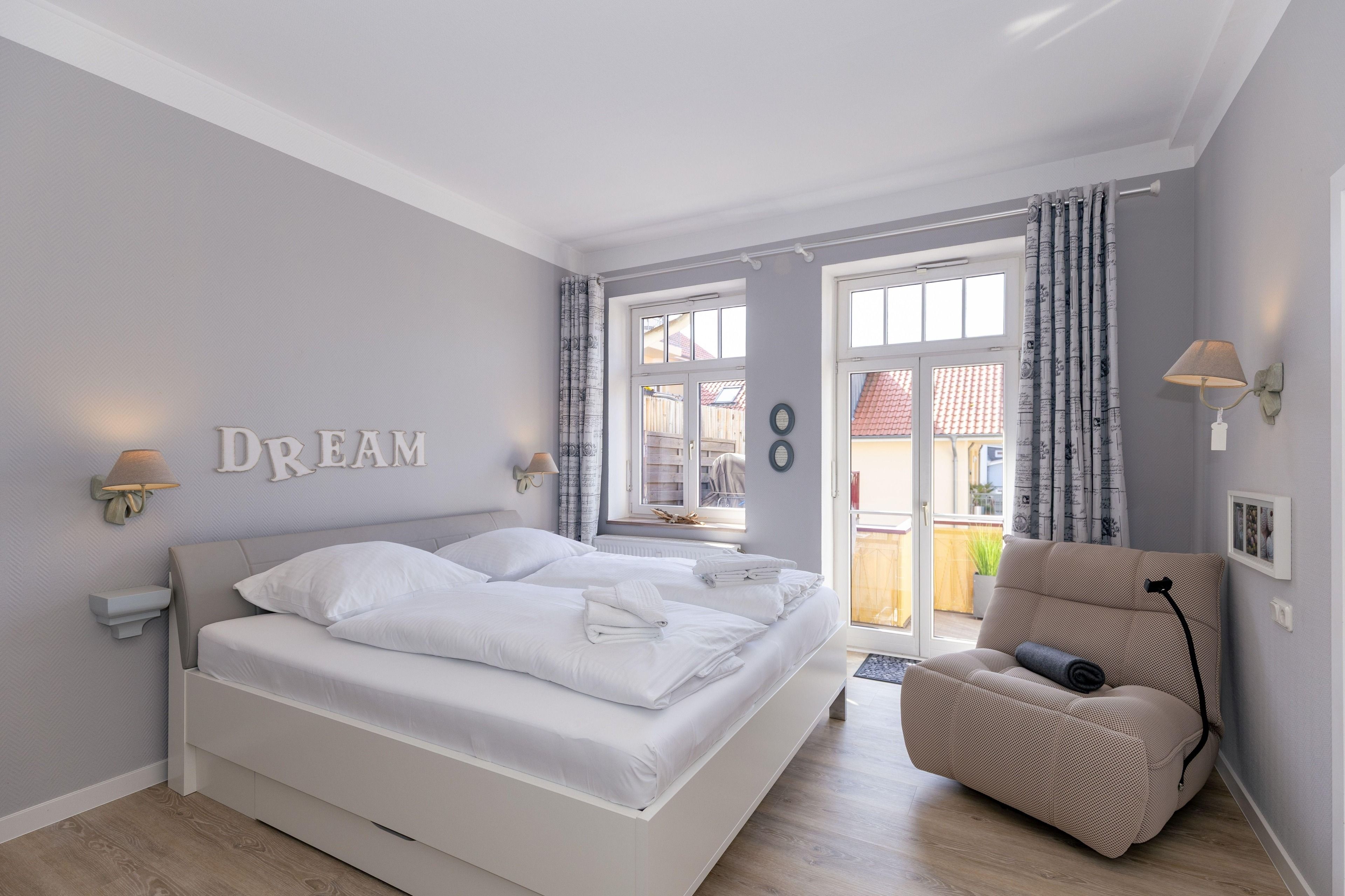 Das hell und freundlich eingerichtete separate Schlafzimmer ist mit einem bequemen Doppelbett (1,80 x 2,00 m) und einem geräumigen Kleiderschrank für Ihre Urlaubsgarderobe ausgestattet. Auch von hier aus haben Sie Zugang zum Südbalkon.