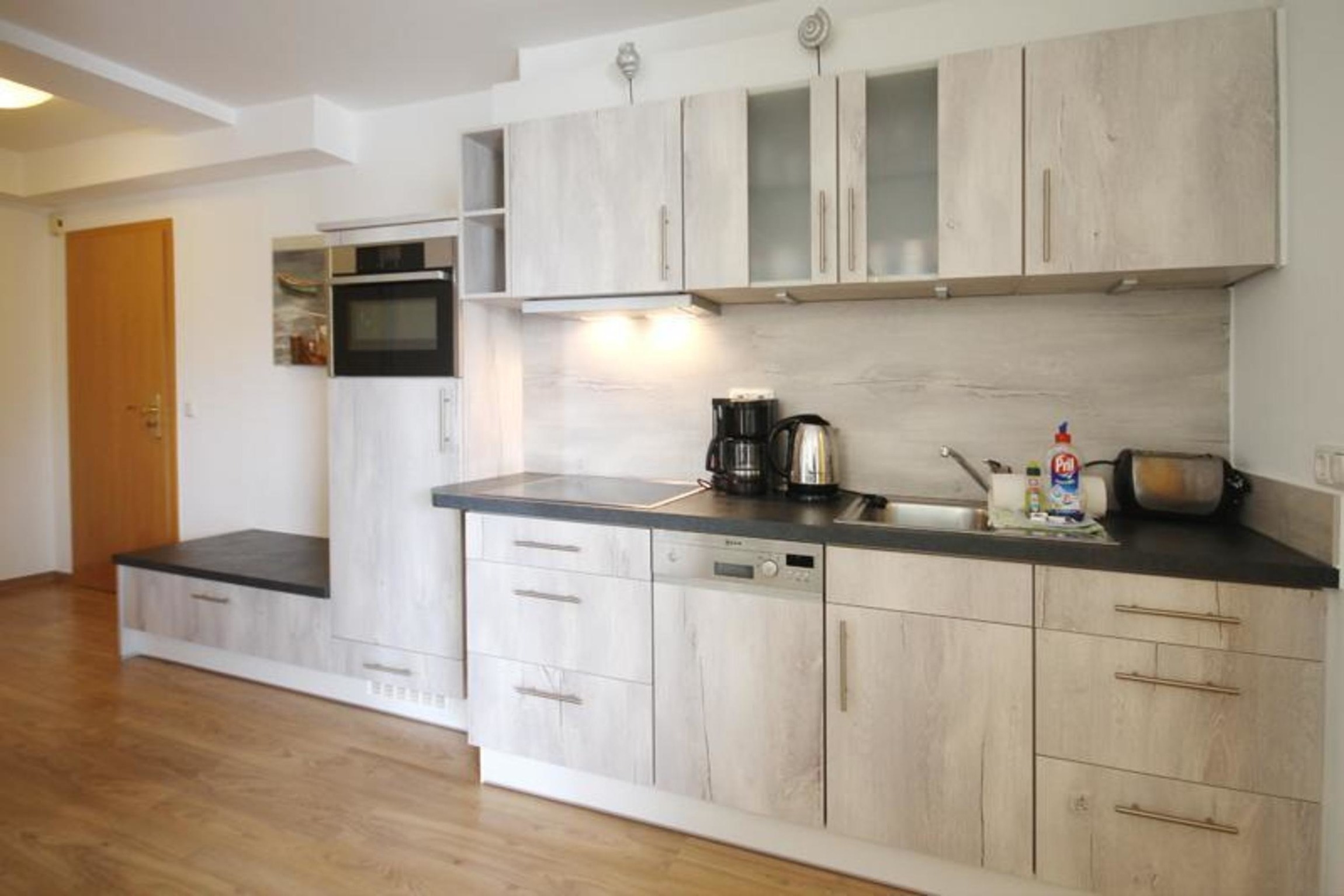 Die im Wohnraum integrierte, offene und voll ausgestattete Küchenzeile bietet Ihnen alle Geräte und Küchenutensilien, die in einer modernen Küche nicht fehlen dürfen.