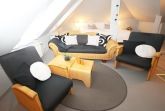 Der Wohnbereich ist geschmackvoll möbliert und mit einem gemütlichen Sofa sowie 2 Sesseln ausgestattet. Ein Flatscreen-TV sowie eine Radio mit CD-Player sorgen für abwechslungsreiche Momente in Ihrer kleinen Wohlfühloase.