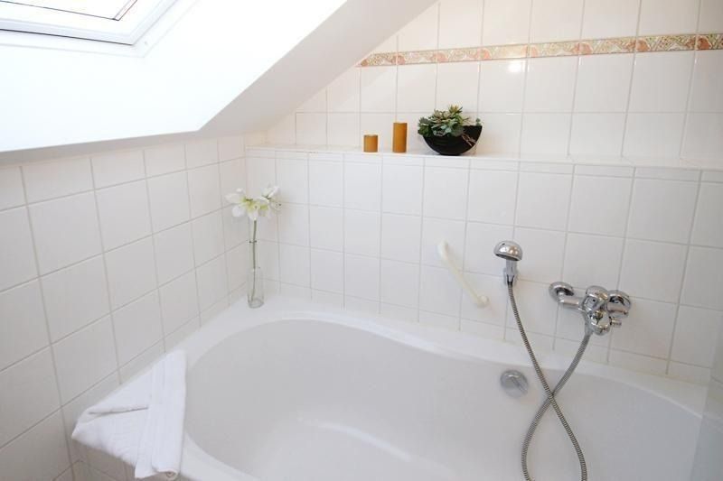 Zu der Wohnung gehört ein helles Tageslichtbad mit WC, Waschbecken, Handtuchheizkörper und einer Badewanne. Durch die Duschabtrennung können Sie natürlich auch eine erfrischende Dusche genießen.