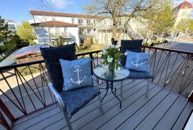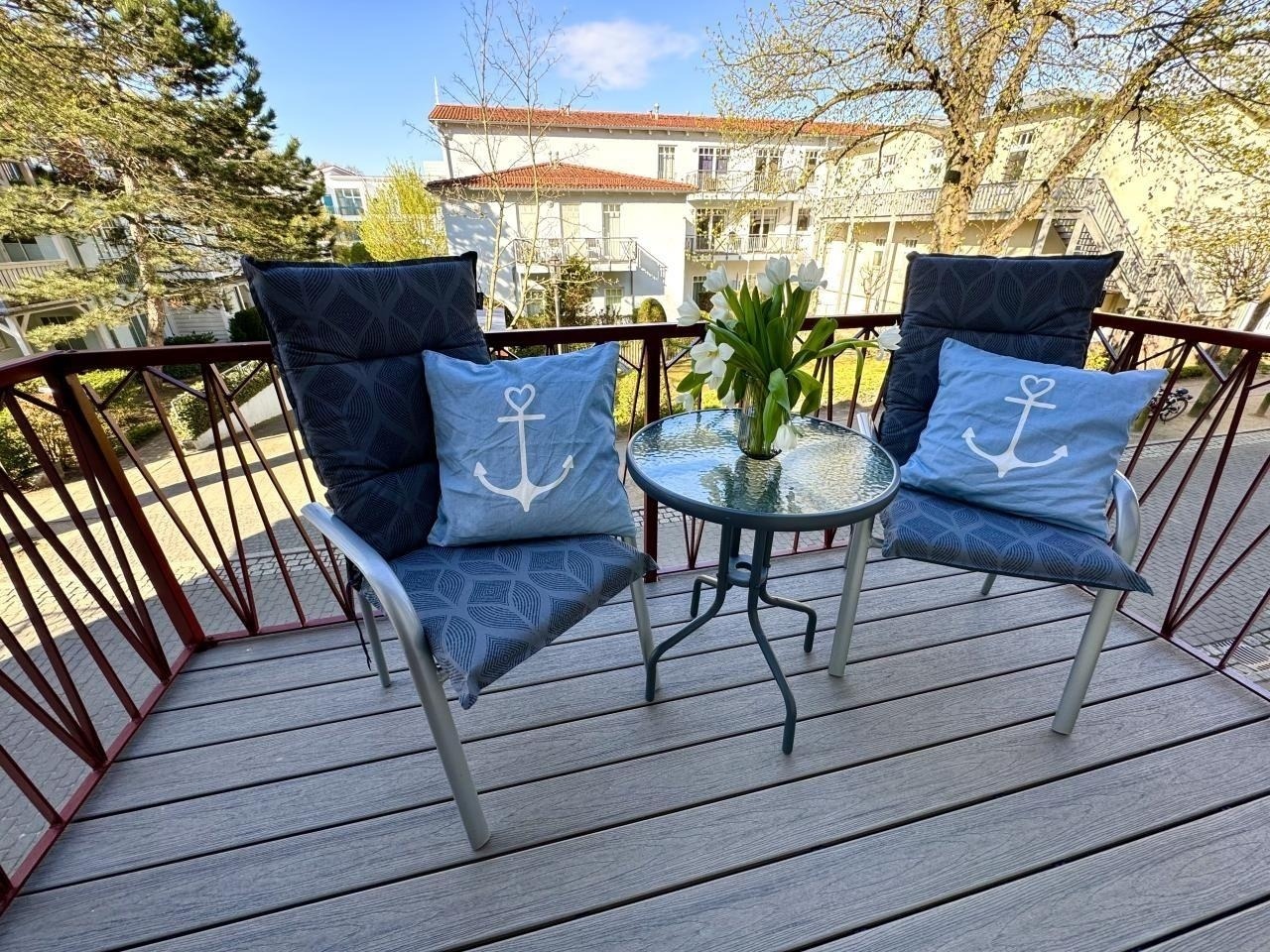 Der Balkon ist zur Nordseite ausgerichtet und mit bequemen Sitzmöbeln ausgestattet.