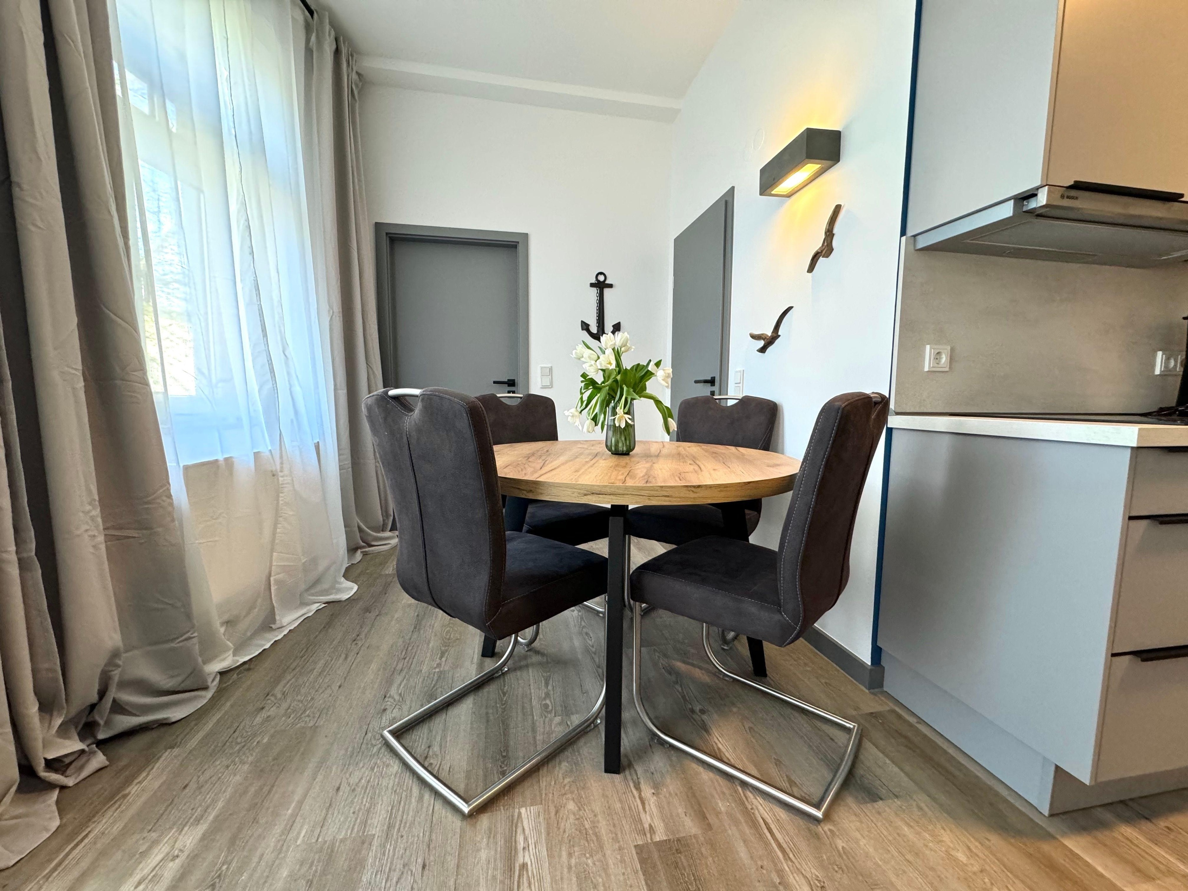 Die Küchenzeile und der Esstisch mit 4 Stühlen bieten Ihnen ausreichend Platz für Ihre Mahlzeiten.