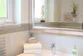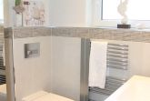 Das Design Badezimmer mit Fussbodenheizung, Ganzglasduschkabine mit bodengleichen Zugang präsentiert sich als Wohlfühloase: Monsuun-Deckendusche und separate Handbrause, Handtuchwärmer, großer Design Aufsatzwaschtisch, 1 Bad-Unterschrank mit 2 großen Vollauszugsschubladen, großer Design-Spiegel, Fön, Kosmetikartikel, 5-fach-Vergrößerungsspiegel. Handtücher und Duschtücher kostenlos.