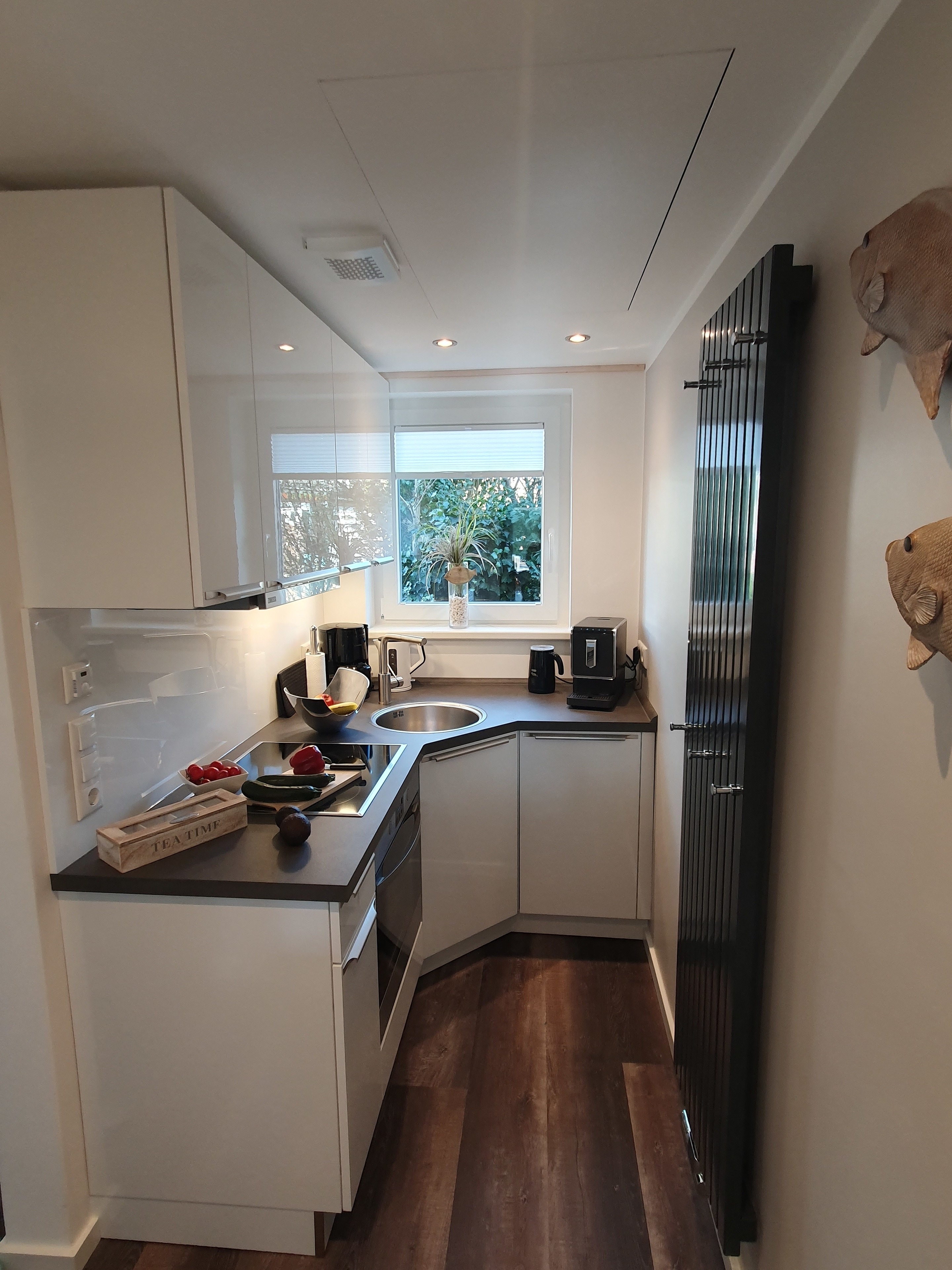 Die moderne Hochglanzküche aus dem Jahr 2023 lässt keine Wünsche offen und ist mit jeglichem Komfort ausgestattet: Geschirrspüler, 4-Zonen-Ceranfeld, Dunstabzug, Backofen, Filter-Kaffeemaschine, Kaffeevollautomaten f. Cappuccino und Latte macchiato, separater Milchaufschäumer, Toaster, Mixer, Eierkocher, Marken-Kochtöpfe, Wasserkocher, exklusives Porzellan (für 12 Personen), 60-teiliges Besteck, Salz- und Pfeffermühle. Zudem bietet die Küche viel Aufbewahr - und Lagerungsplatz für Ihre Einkäufe. Alle Reinigungsutensilien stehen kostenlos zur Verfügung.